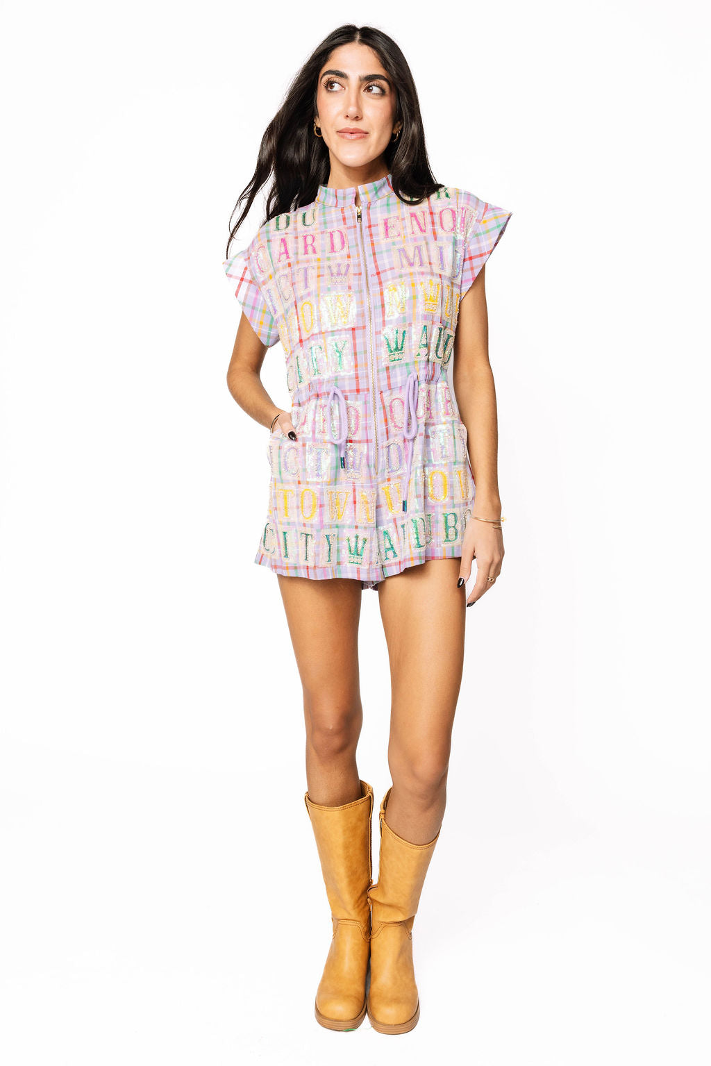 Embrace your inner maximalist in this show-stopping lavender plaid romper, featuring a vibrant New Orleans street tile design that screams celebration. The convenient zip-up front makes getting party-ready effortless, while the bold plaid base and multicolor tile accents create an unforgettable look. Whether you're hitting the Mardi Gras parade route or turning heads at a festive gathering, this romper delivers serious style with zero apologies. Perfect for those who believe more sparkle, more color, and more fun is always the answer.