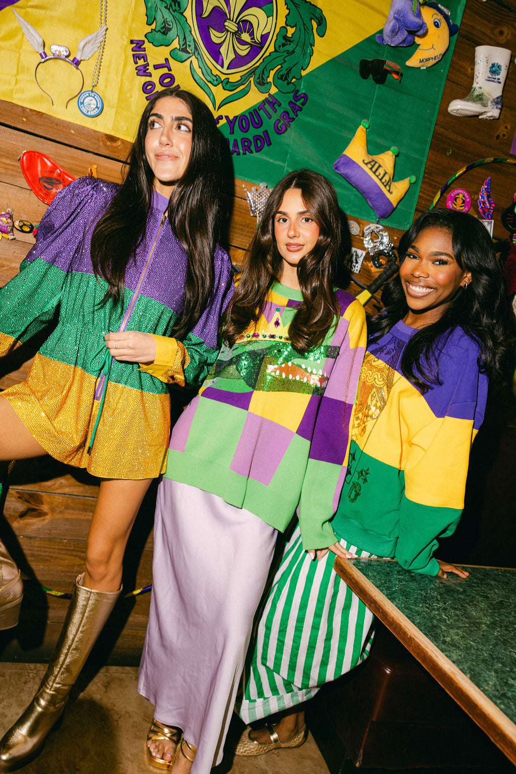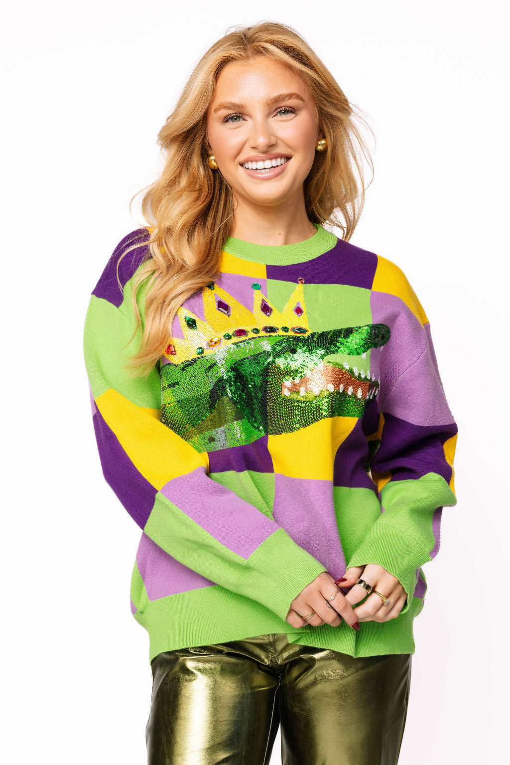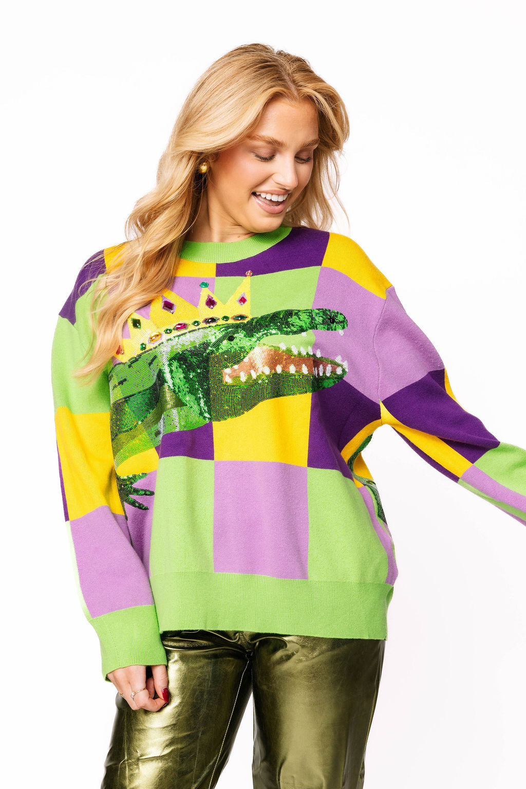 Get ready to turn heads this Mardi Gras season in our Checkered Alligator Queen Sweater! This playful knit features a bold checkered pattern with a show-stopping wrap-around sequin alligator design that sparkles from every angle. Perfect for celebrating in style, whether you're hitting the parade route or the party scene. Channel your inner queen and let those sequins do the talking!