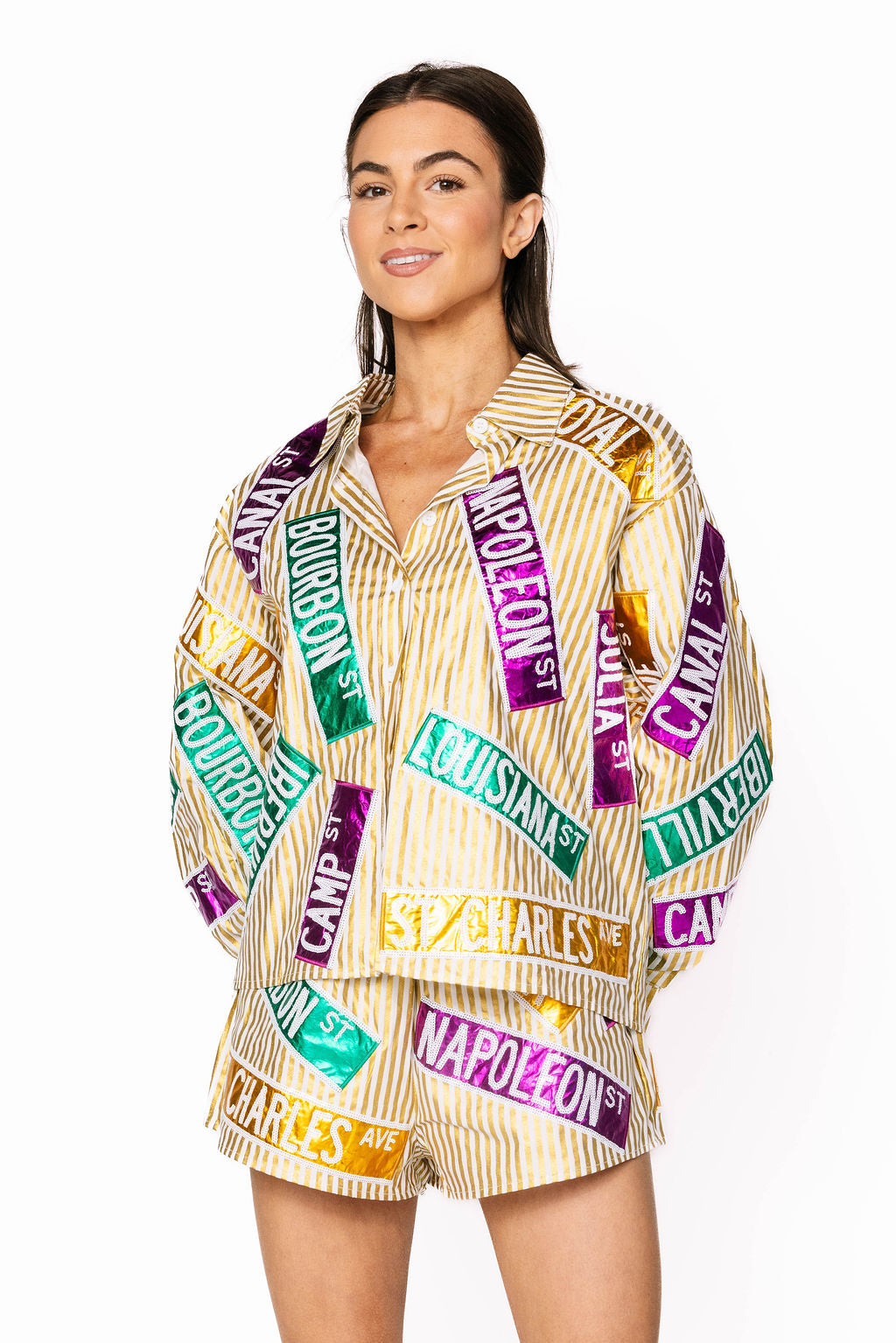 Strut down the street in this show-stopping button-up featuring bold gold and white stripes paired with vibrant New Orleans street sign graphics. Perfect for channeling that Big Easy energy with serious style points. Mix and match with our coordinating shorts to complete your head-to-toe sparkle moment. Whether you're hitting the town or making a statement, this metallic-trimmed top brings the fun and the flair.