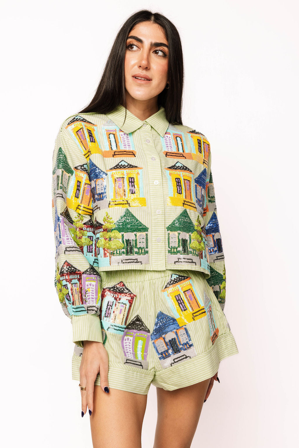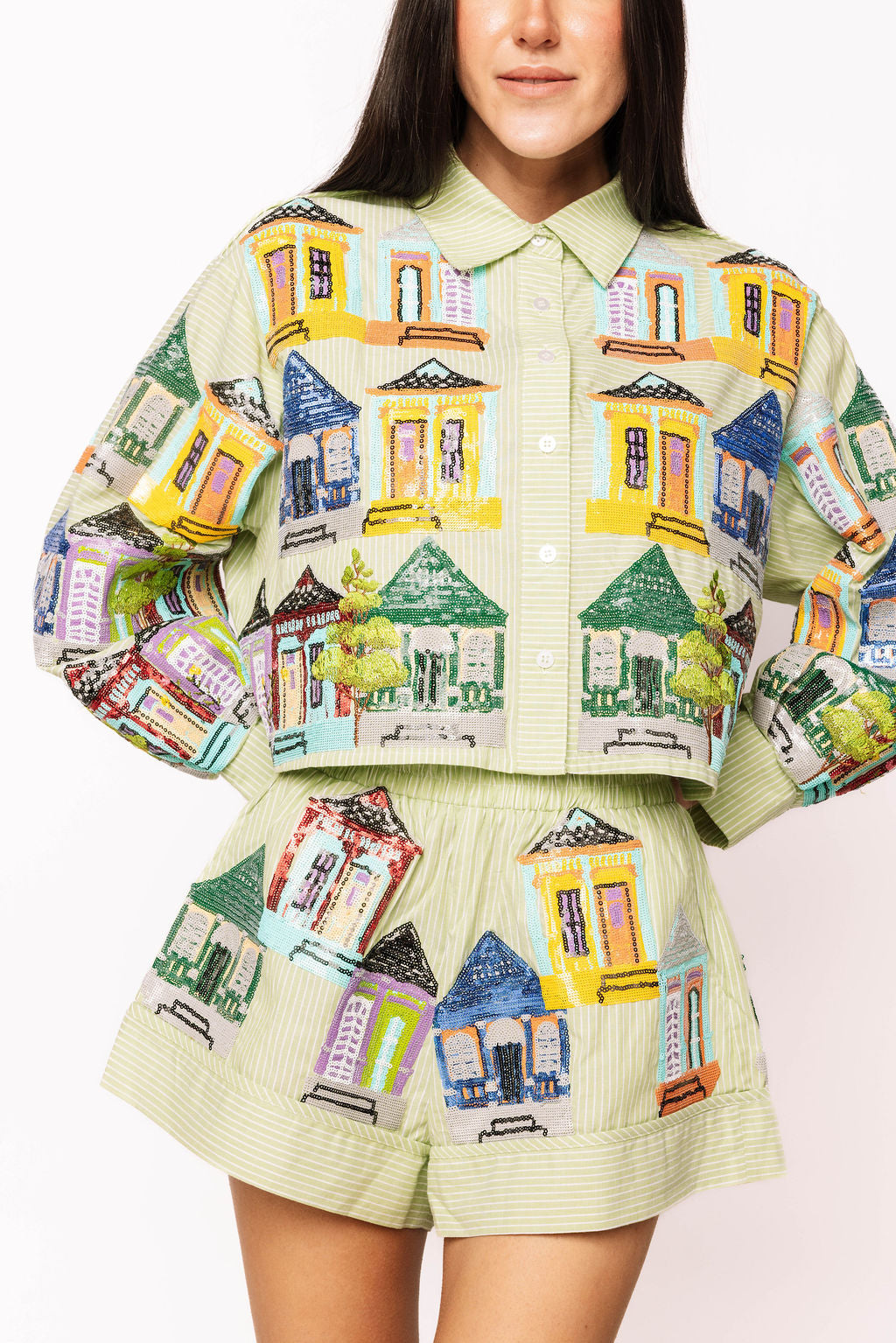 Step into Southern charm with these pale green shorts featuring a dazzling sequin New Orleans house design. The crisp white stripes add preppy polish while the shimmering embellishment brings major sparkle to your wardrobe. Perfect for capturing that iconic NOLA aesthetic with a modern twist. Style it with the matching top for an effortlessly coordinated look that's ready for any occasion—from casual outings to festive celebrations.