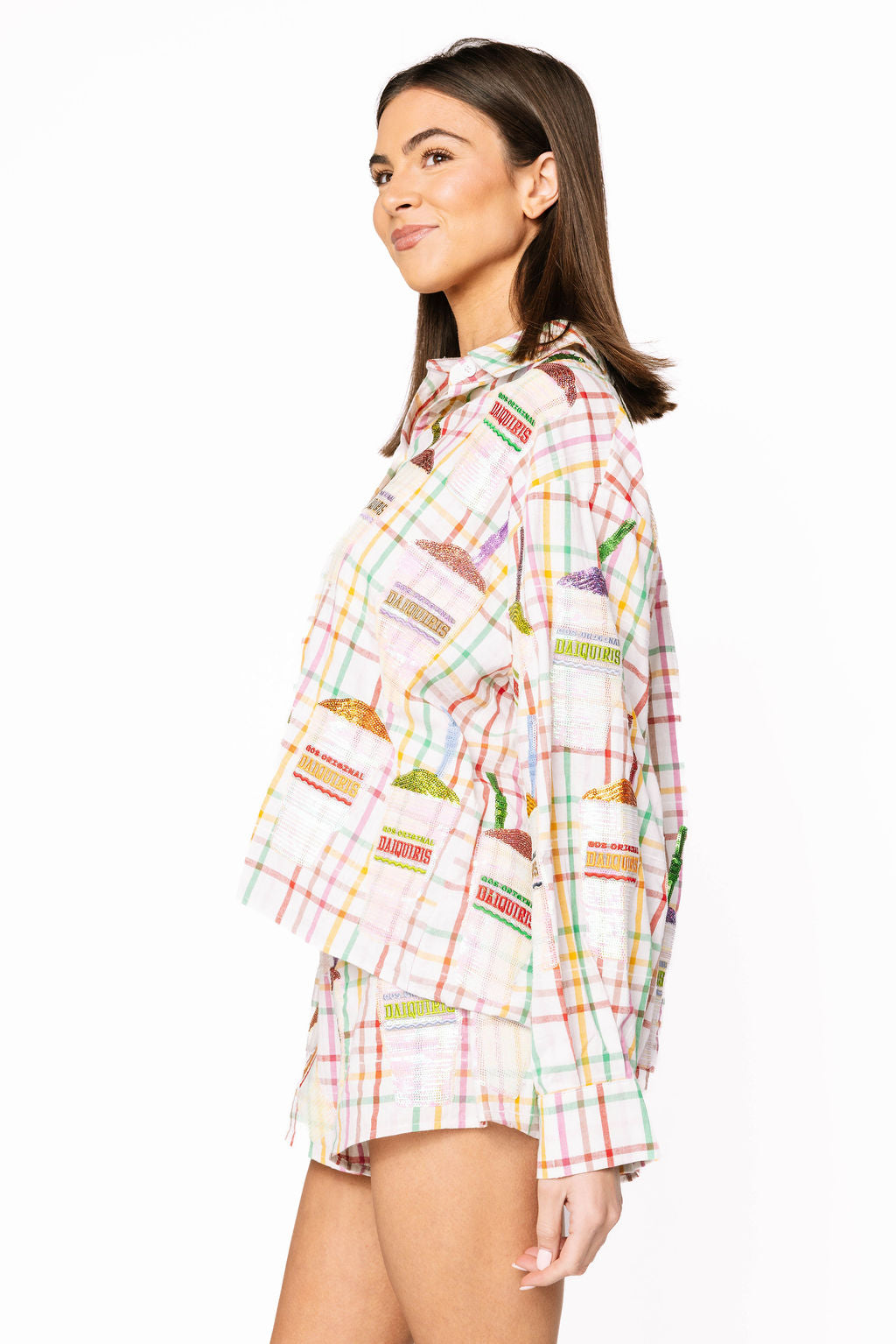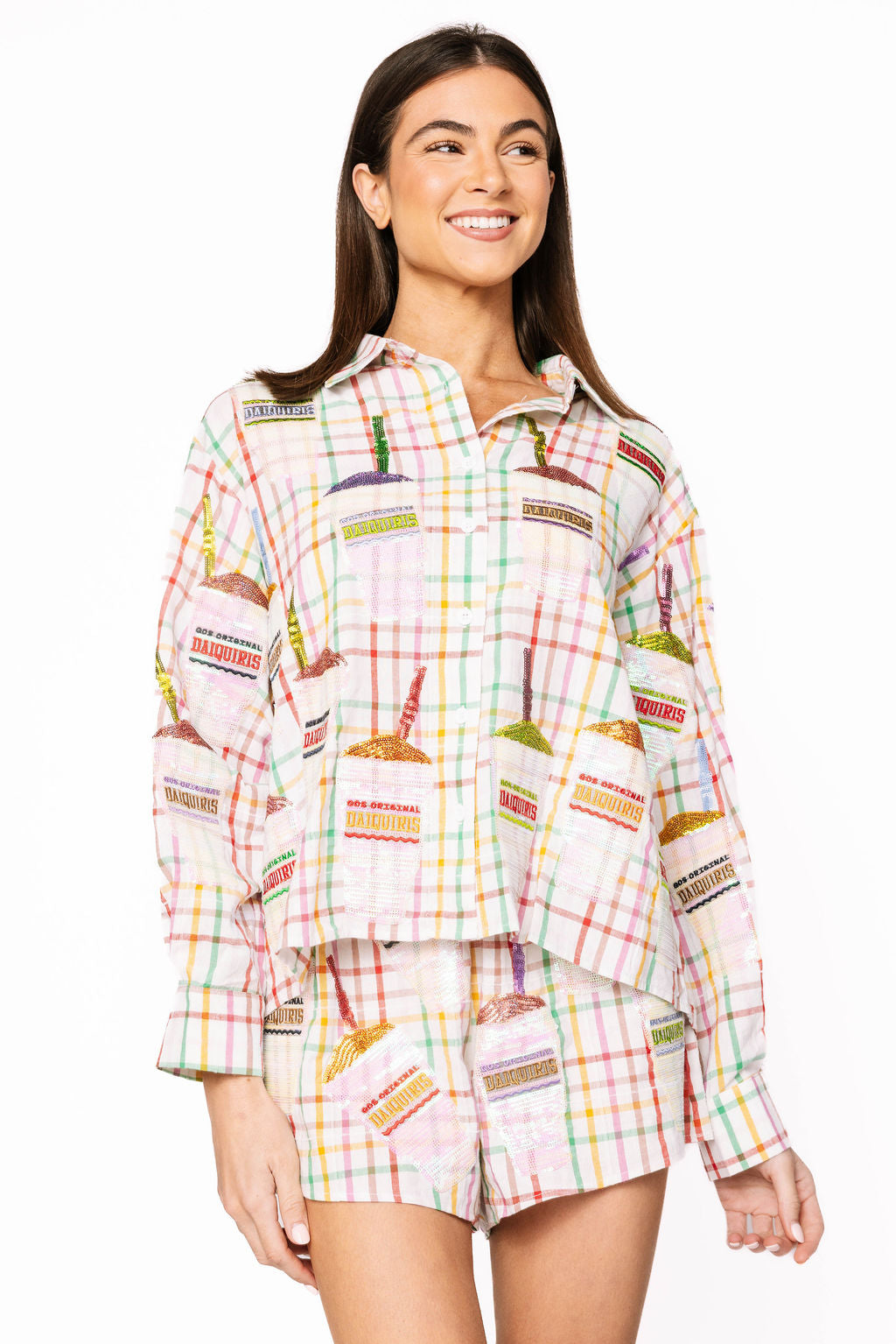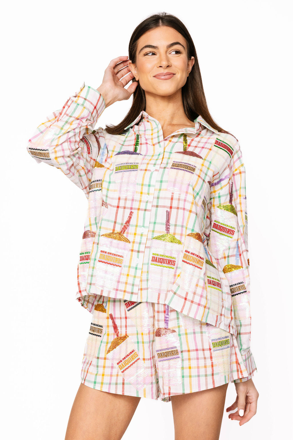 Get ready to turn heads this Mardi Gras season in this vibrant rainbow plaid button-up top! Featuring a dazzling sequin daiquiri design on both the front and back, this long-sleeve cotton tee brings festive flair to your celebration. The playful plaid pattern pairs perfectly with our matching shorts for a coordinated look that's sure to sparkle. Whether you're hitting the parade route or dancing the night away, this eye-catching top delivers fun, comfort, and serious style points.