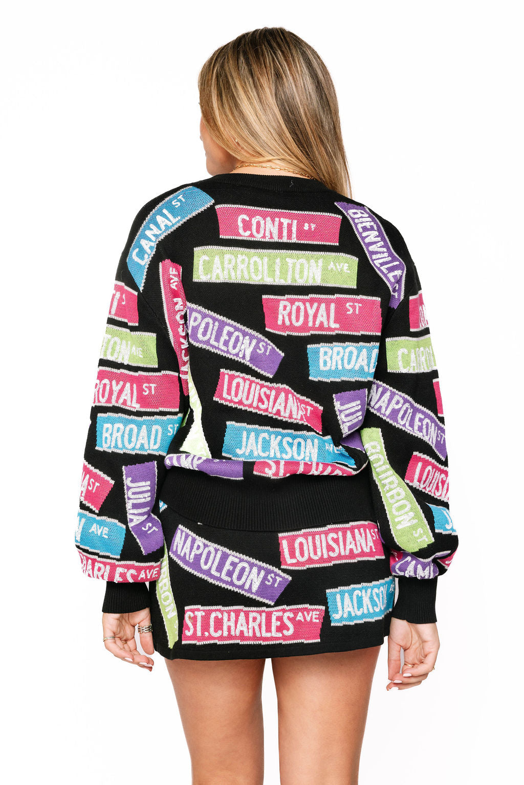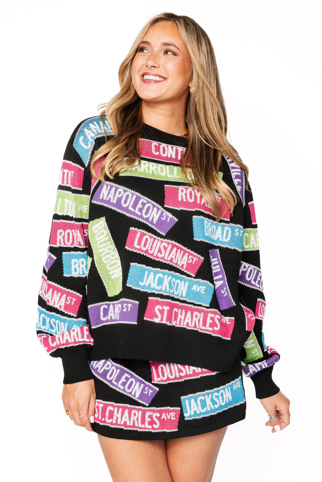 Step into Big Easy style with this playful two-piece set featuring iconic NOLA street signs splashed across a cozy black sweater paired with a matching skirt. Perfect for anyone who wants to celebrate New Orleans charm with a fun, coordinated look. The multi-colored graphic design brings that vibrant street culture vibe straight to your wardrobe. Mix, match, or wear together—this set gives you flexibility and personality in every outfit.