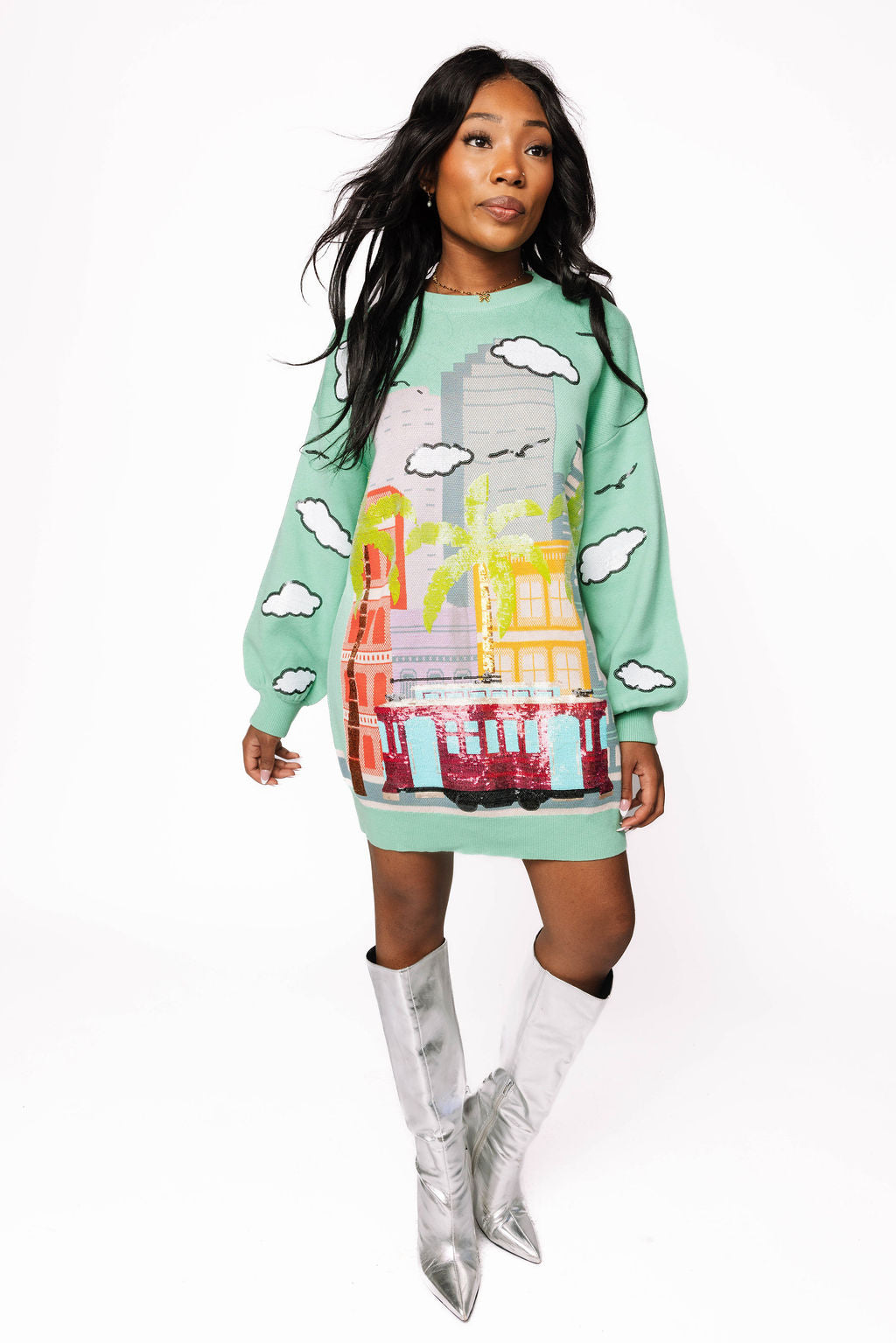 Step into New Orleans charm with this mint green sweater dress, inspired by the iconic Canal Street and its beloved streetcar. The soft, cozy knit hugs you in all the right places while the playful streetcar detail adds a touch of whimsy and wanderlust. Perfect for casual outings or layering through cooler months, this dress brings vintage-inspired style with a modern twist. Whether you're dreaming of the Big Easy or just want to add some character to your wardrobe, this piece delivers comfort and conversation-starting flair.