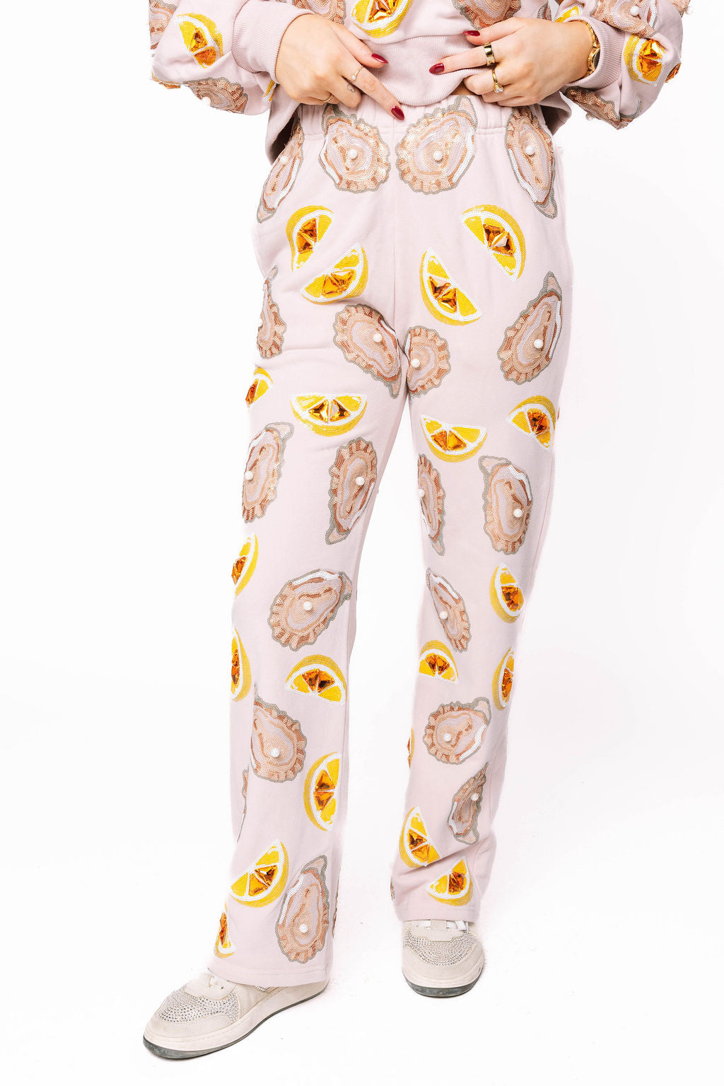 Dive into coastal charm with this playful pale pink sweat pant featuring whimsical oyster and lemon prints. Perfect for beach days, summer getaways, or anyone who loves a splash of seaside sass. The soft pink hue pairs beautifully with the fun graphic design, making it an instant wardrobe favorite. Lightweight and comfortable, it's your ticket to looking effortlessly chic while channeling that carefree, beachy vibe.