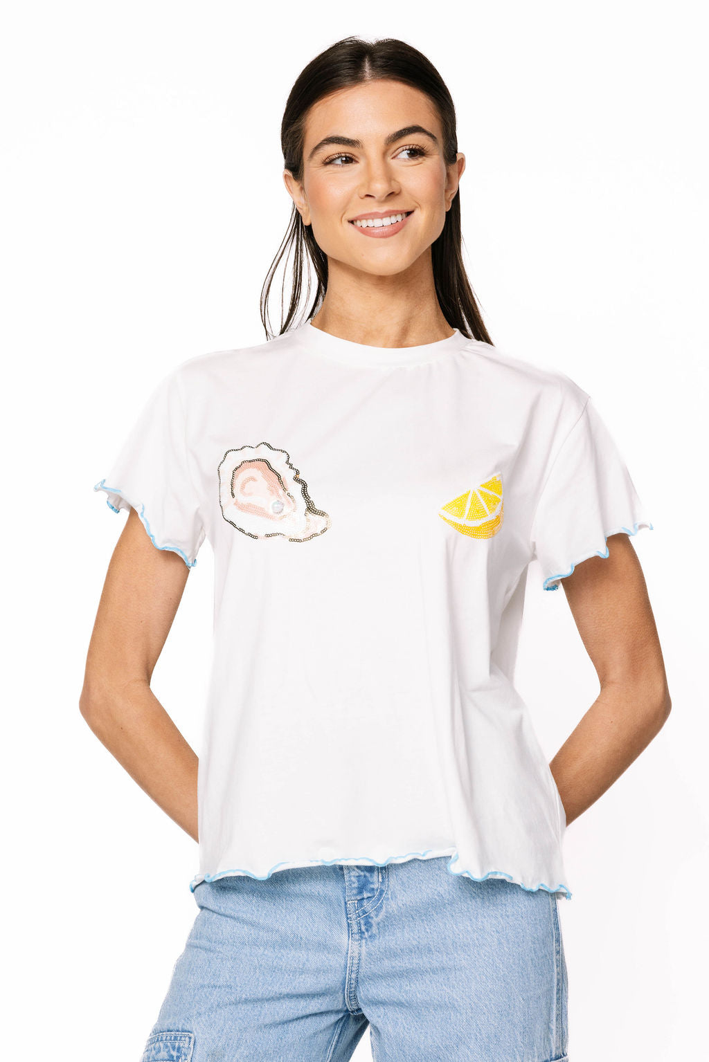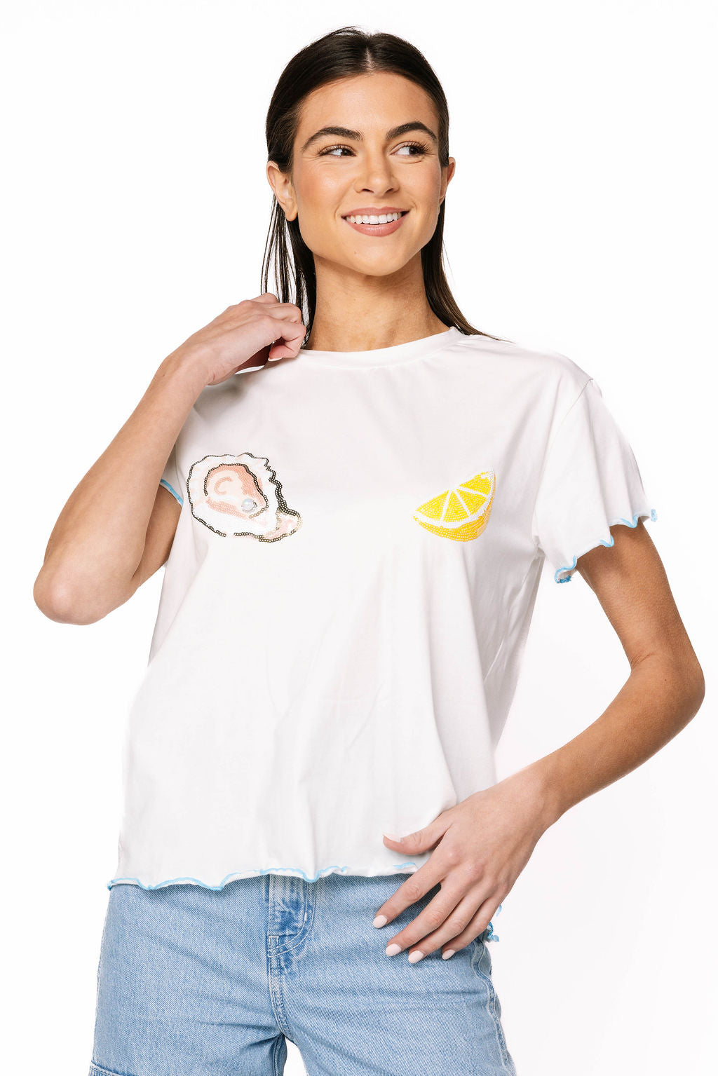 Taste the flavor of the Gulf Coast with this white Oyster & Lemon tee! Adorned with charming frill edges, this playful top celebrates two of Louisiana's most beloved culinary treasures. Fresh, fun, and totally wearable, it's perfect for seafood lovers and NOLA enthusiasts alike. The delicate detailing adds a touch of elegance while keeping things light and breezy. Slip it on and let everyone know you've got impeccable taste—both in fashion and in food!