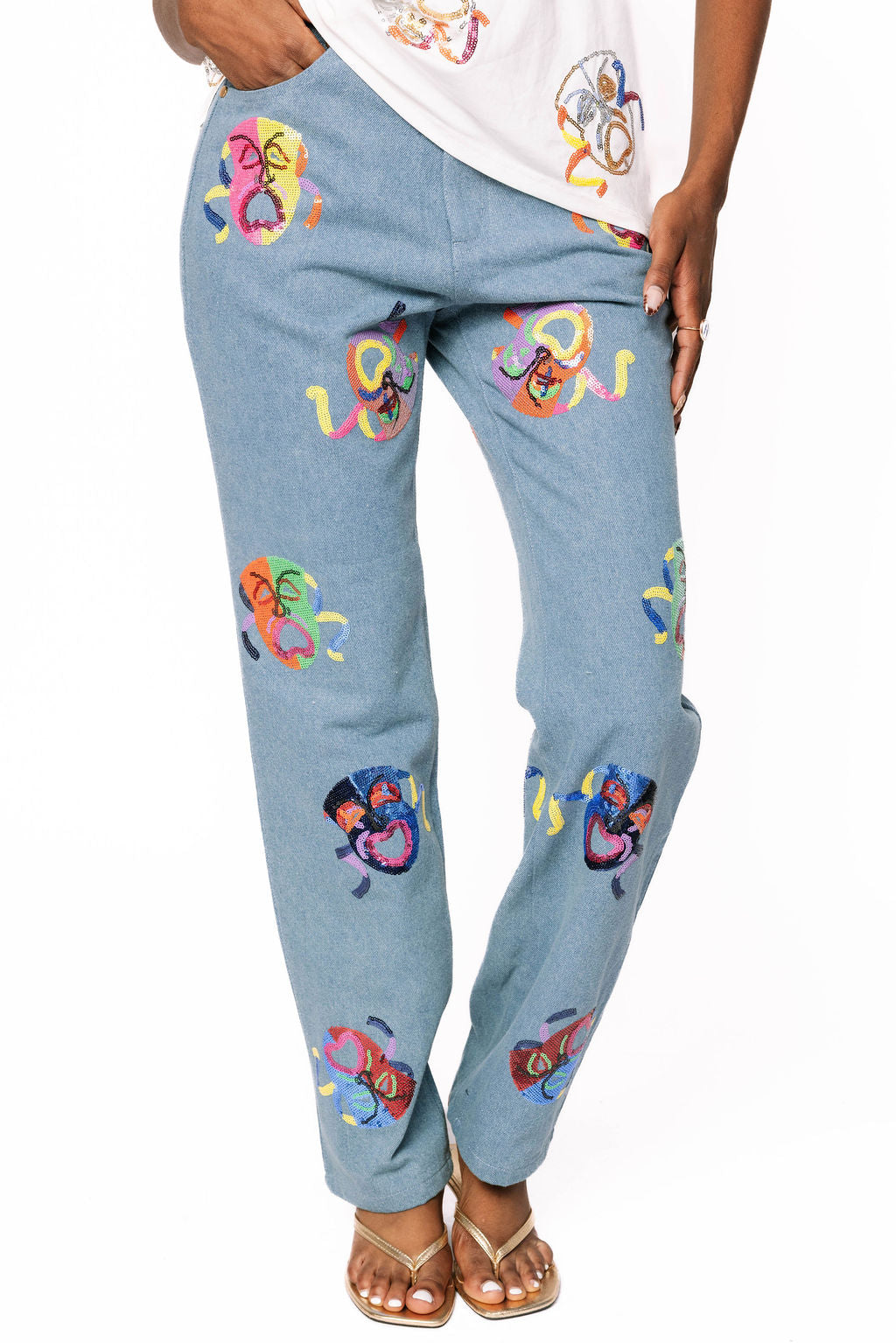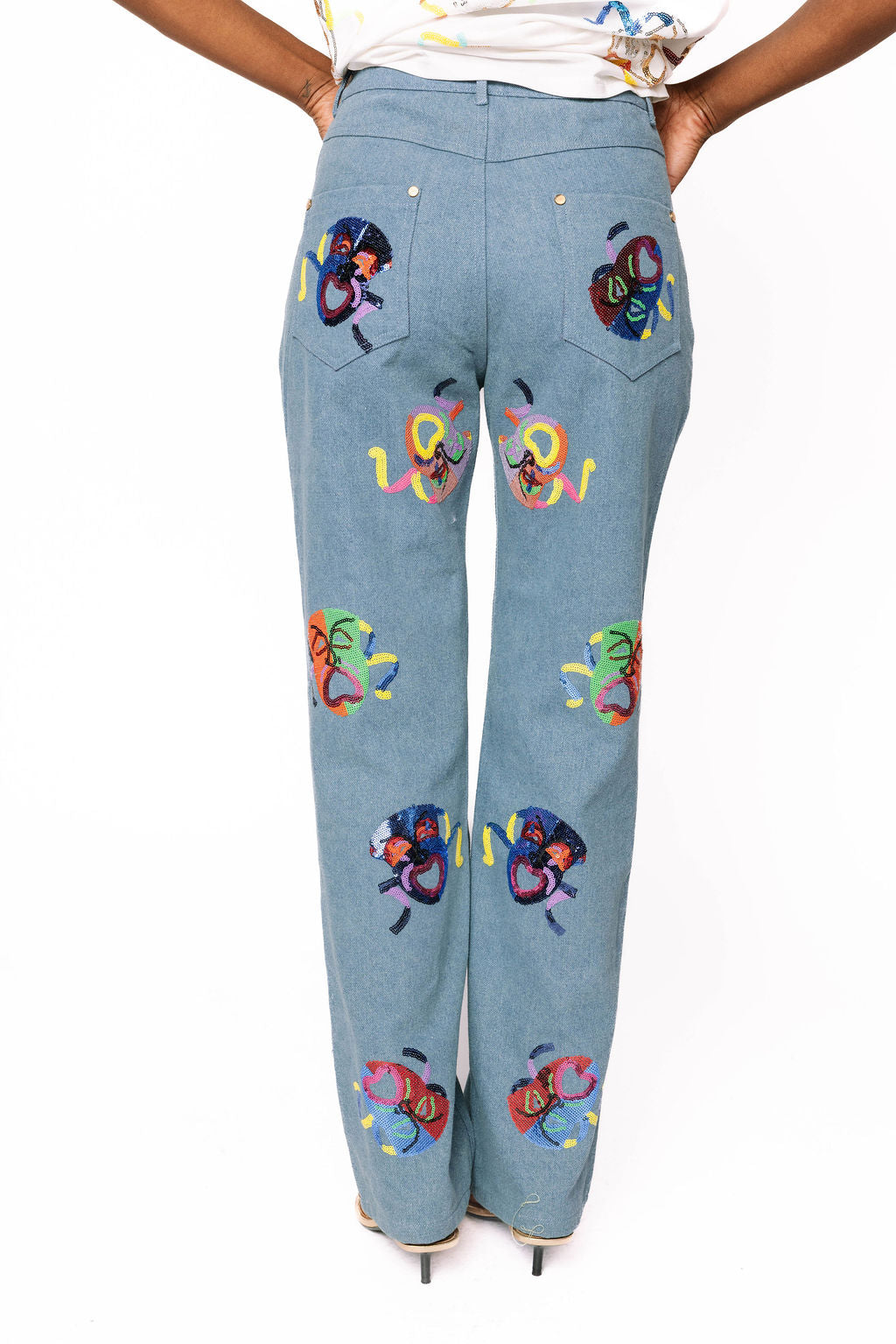 Sample Sequin Rainbow Multi Mardi Gras Mask Denim Pant