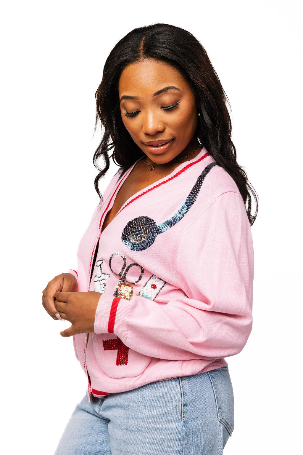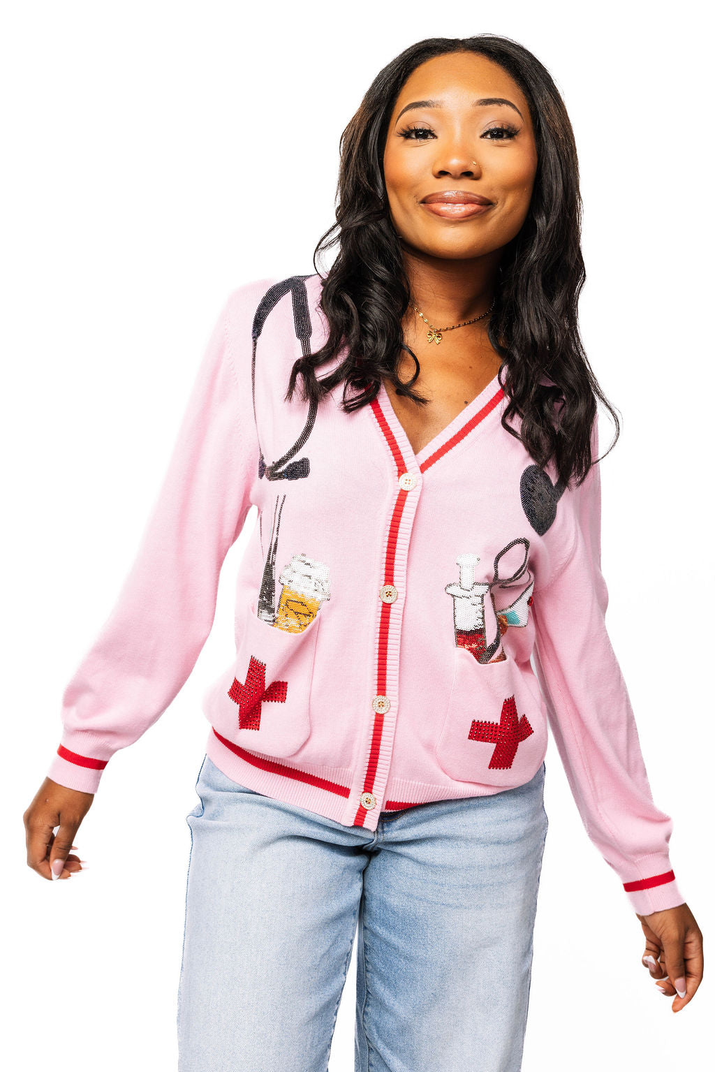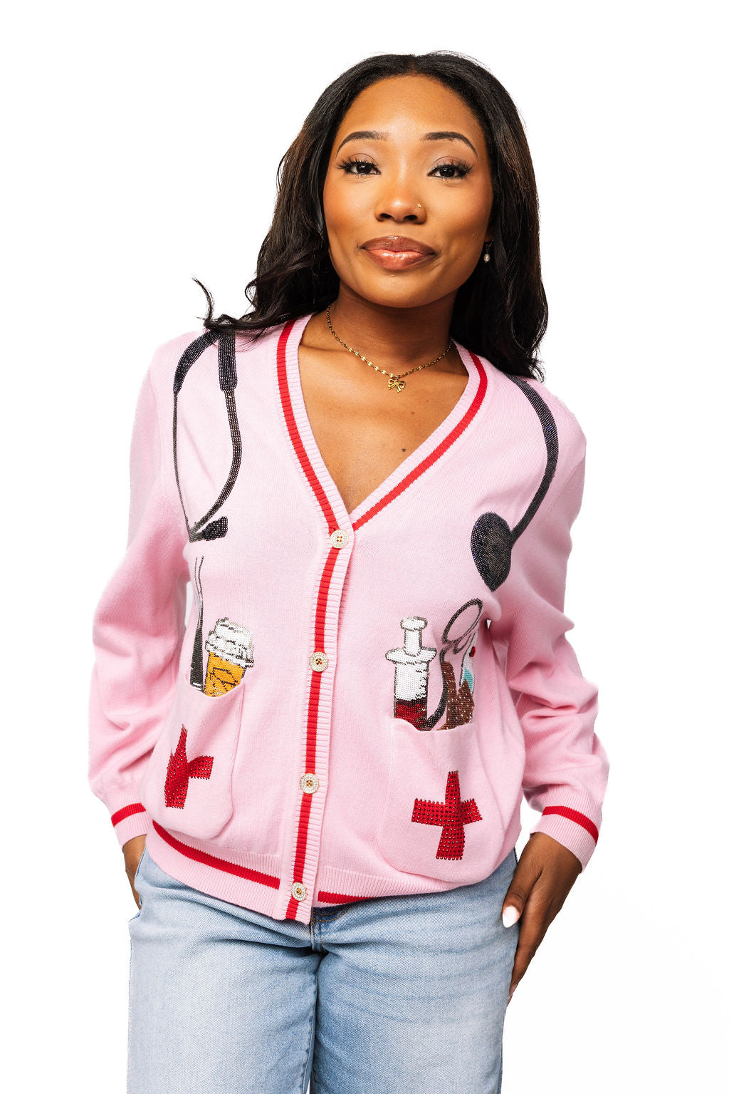 This playful pink cardigan brings a fun twist to medical-themed fashion with its charming instrument designs scattered throughout. Perfect for healthcare professionals who want to show off their passion beyond the clinic, or anyone who appreciates a quirky conversation starter. The button-up style makes it easy to layer over scrubs or casual outfits, while the soft pink hue adds a cheerful pop of color to your wardrobe. Whether you're celebrating a future doctor, nurse, or medical student, or just love the unique aesthetic, this cardigan combines comfort with personality in the most delightful way.