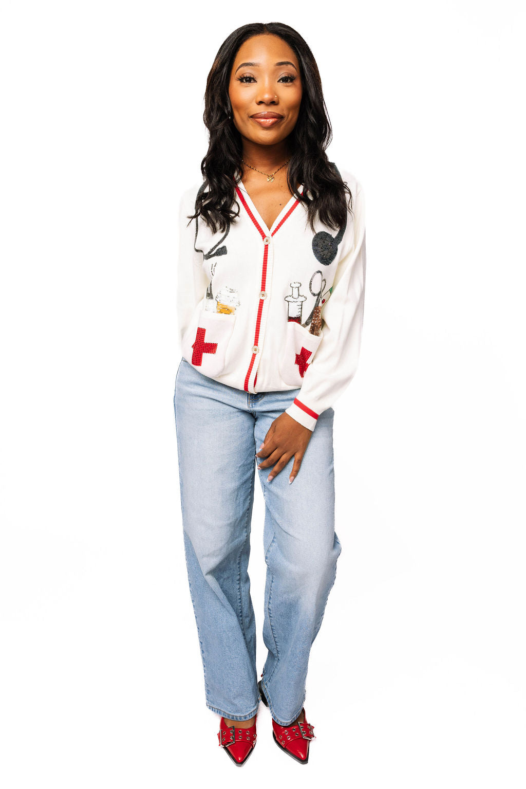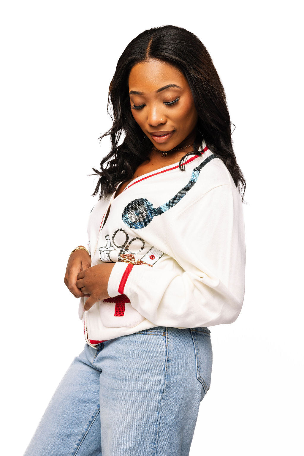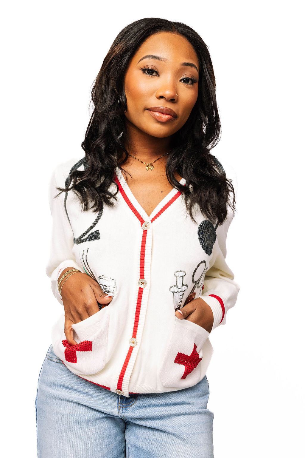 Meet your new favorite cardigan—a crisp white button-up that celebrates the healing profession with style. Featuring vibrant red crosses on the pockets and medical instrument designs this piece is made for nurses who wear their calling with pride. Layer it over scrubs for an instant mood boost, or rock it solo for off-duty comfort. Because saving lives shouldn't mean sacrificing personality.