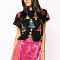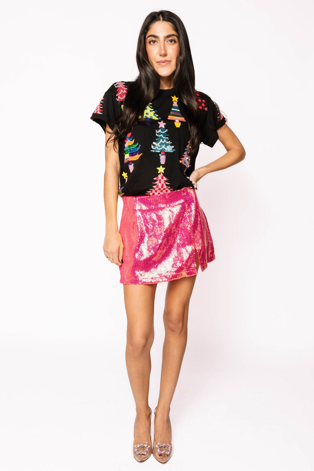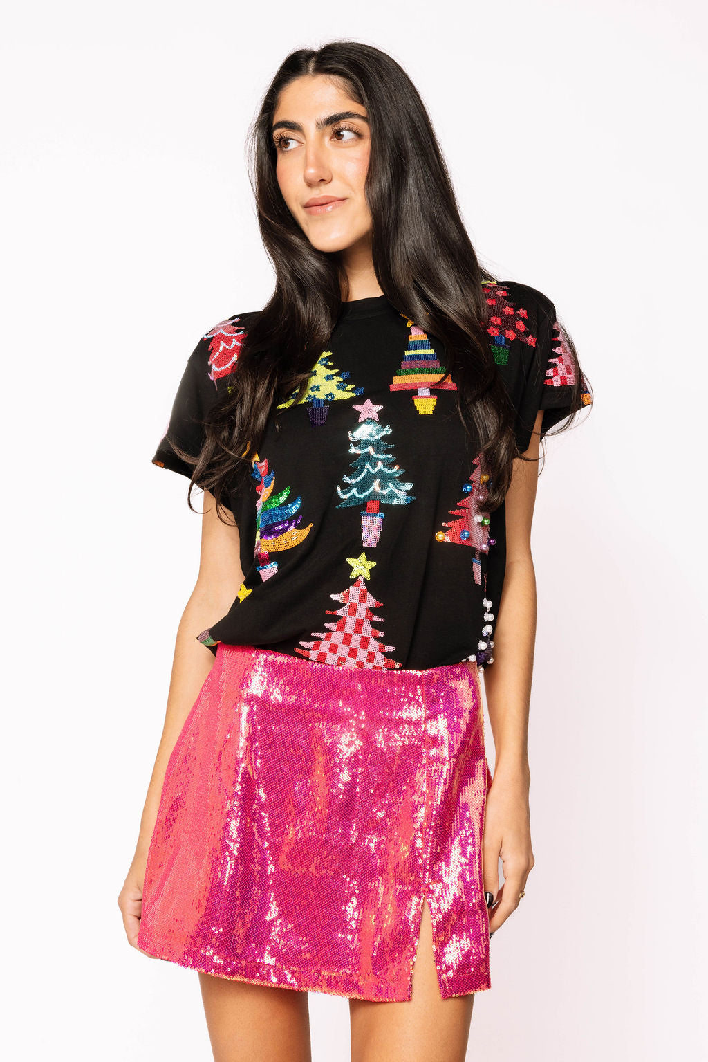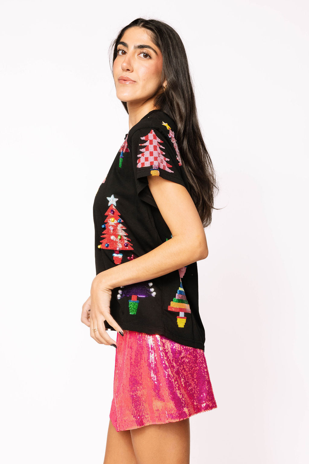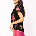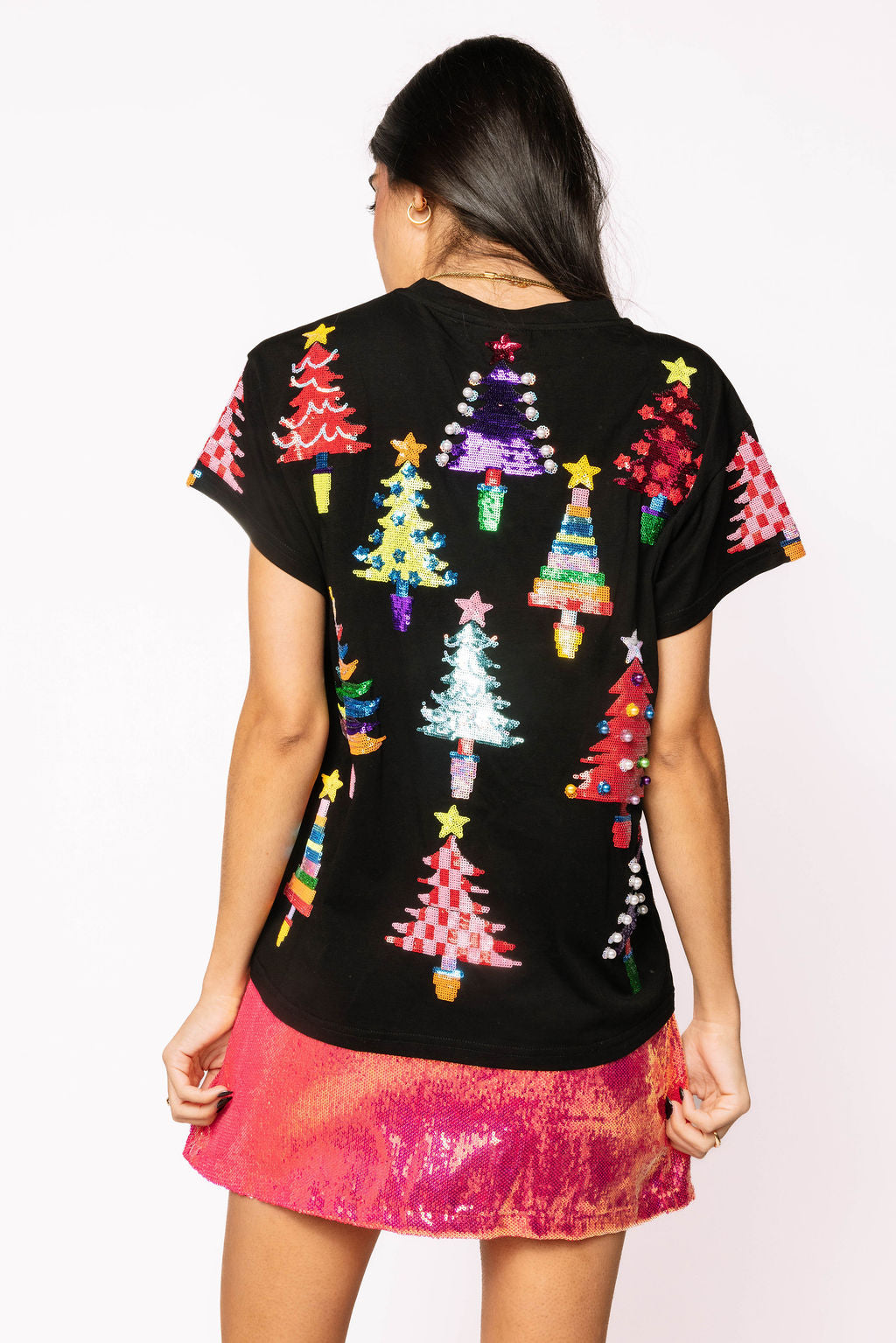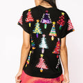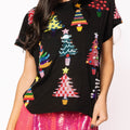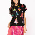 Celebrate the festive season in style with this Black Colorblock Trees Tee. Featuring vibrant, multi-colored Christmas trees across a sleek black backdrop, this playful tee adds holiday cheer to your casual wardrobe. It's perfect for spreading joy during cozy gatherings or casual days out, making every moment a little brighter and merrier.
