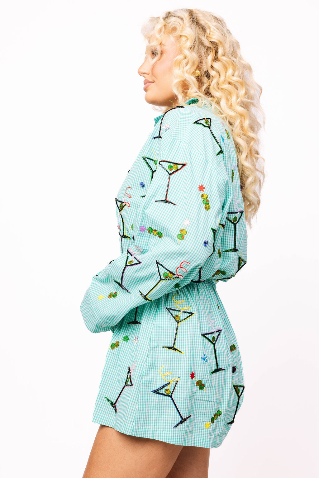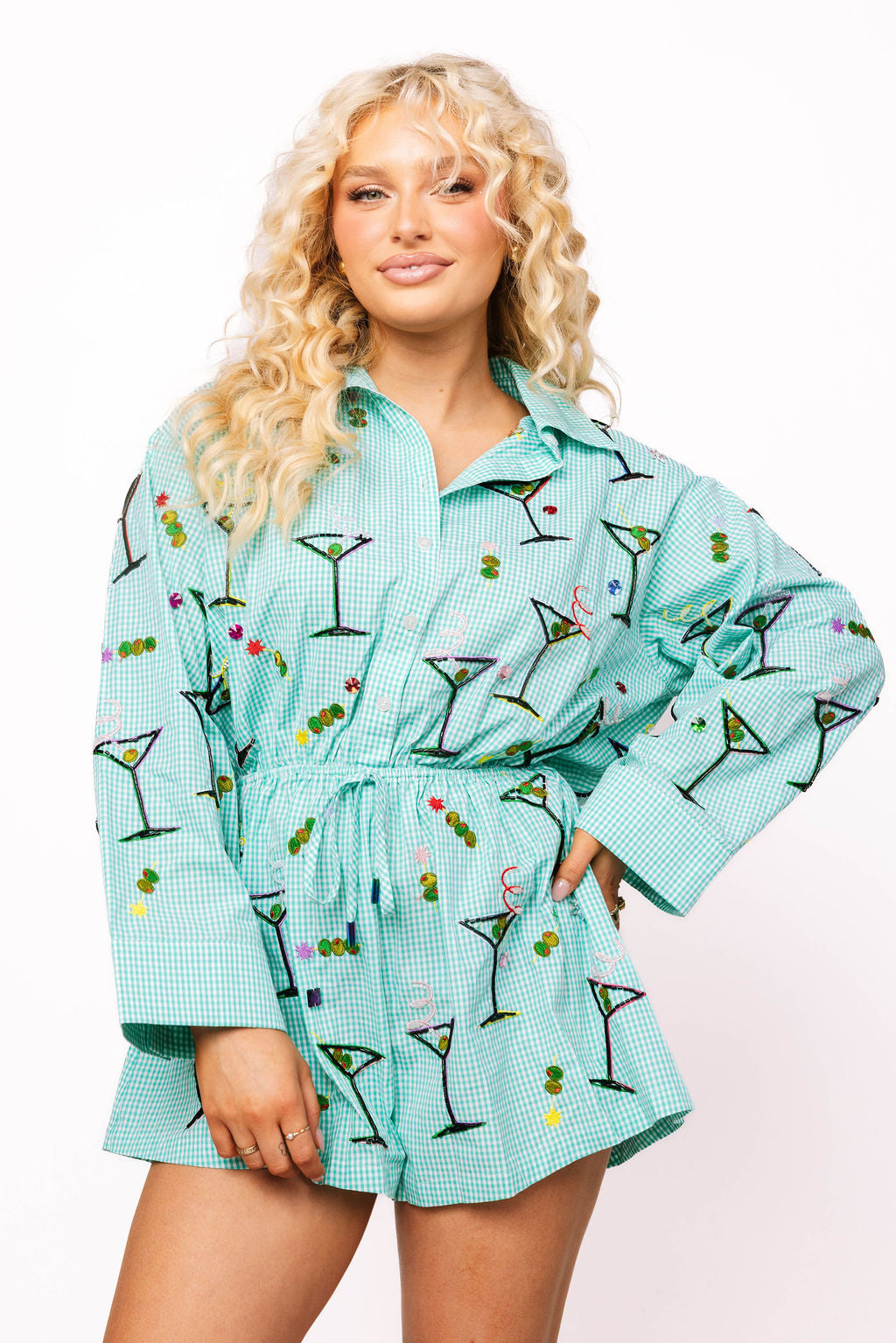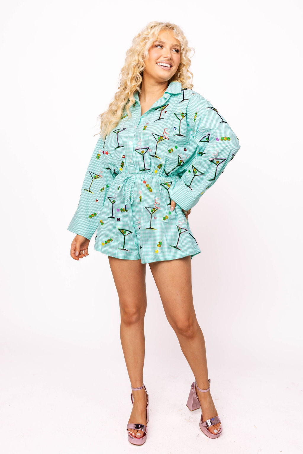 Raise a glass to effortless style with this charming gingham romper! Featuring a crisp green and white checked pattern adorned with cheeky martini designs, it's perfect for brunch dates or casual outings. The button-up front and adjustable tie waist create a flattering silhouette you can customize to fit just right. Playful, comfortable, and undeniably fun—this romper proves that looking fabulous doesn't require much effort.