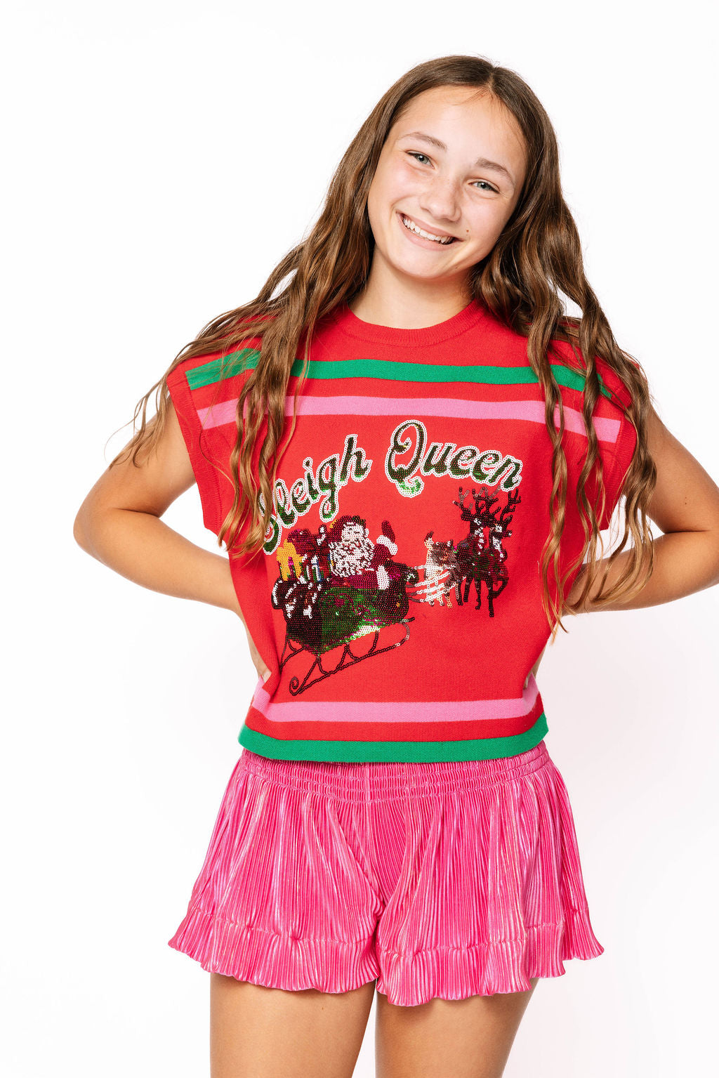 Get ready for holiday fun with the Kids Red, Green & Pink 'Sleigh Queen' Stripe Top! This cheerful shirt is perfect for little ones to match their mini-me in festive style. Bright stripes and a festive vibe make it a playful choice for all your seasonal celebrations.