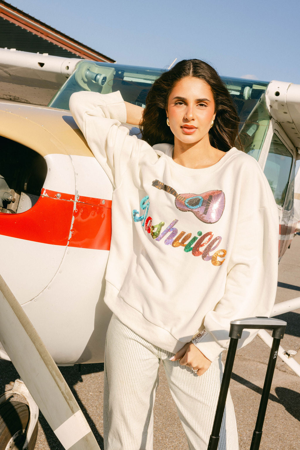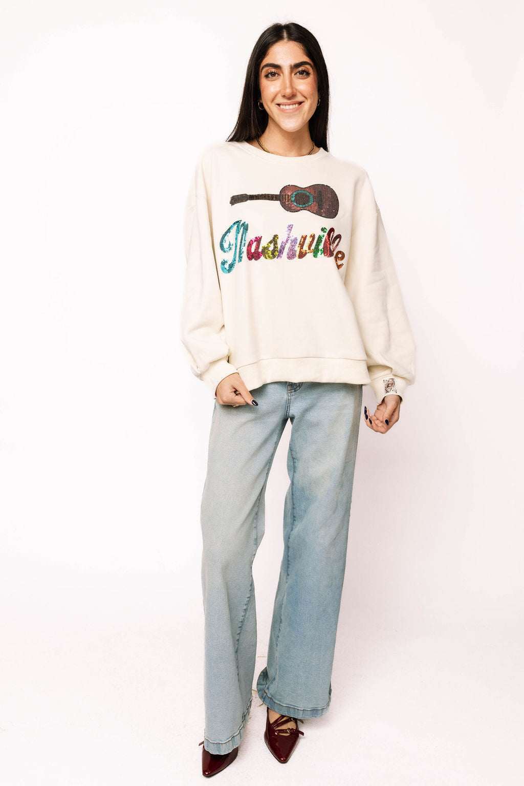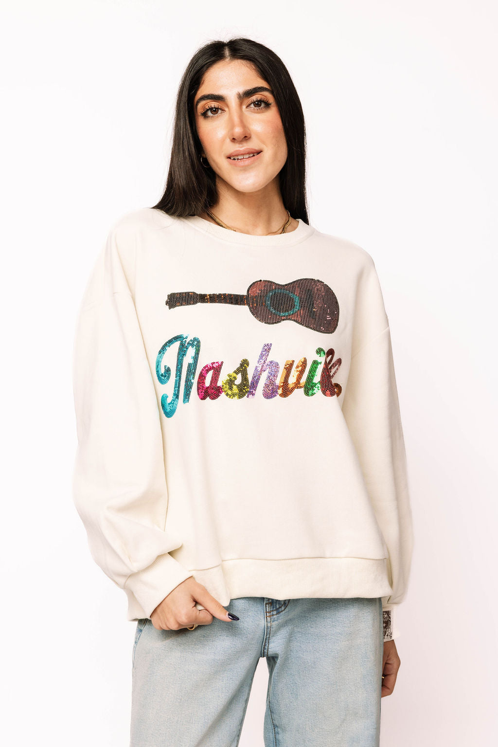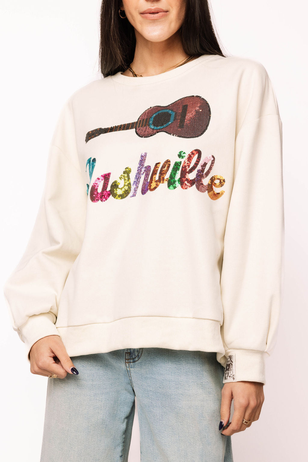 Strut into Music City vibes with this light beige sweatshirt that's basically a wearable love letter to Nashville. The front features "Nashville" spelled out in dazzling multicolor sequins that catch the light with every move, paired with a charming guitar design that celebrates the heart of country music. Perfect for concert-goers, music lovers, and anyone who wants to sparkle while showing their Southern pride. Cozy, eye-catching, and ready to turn heads wherever you roam.