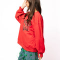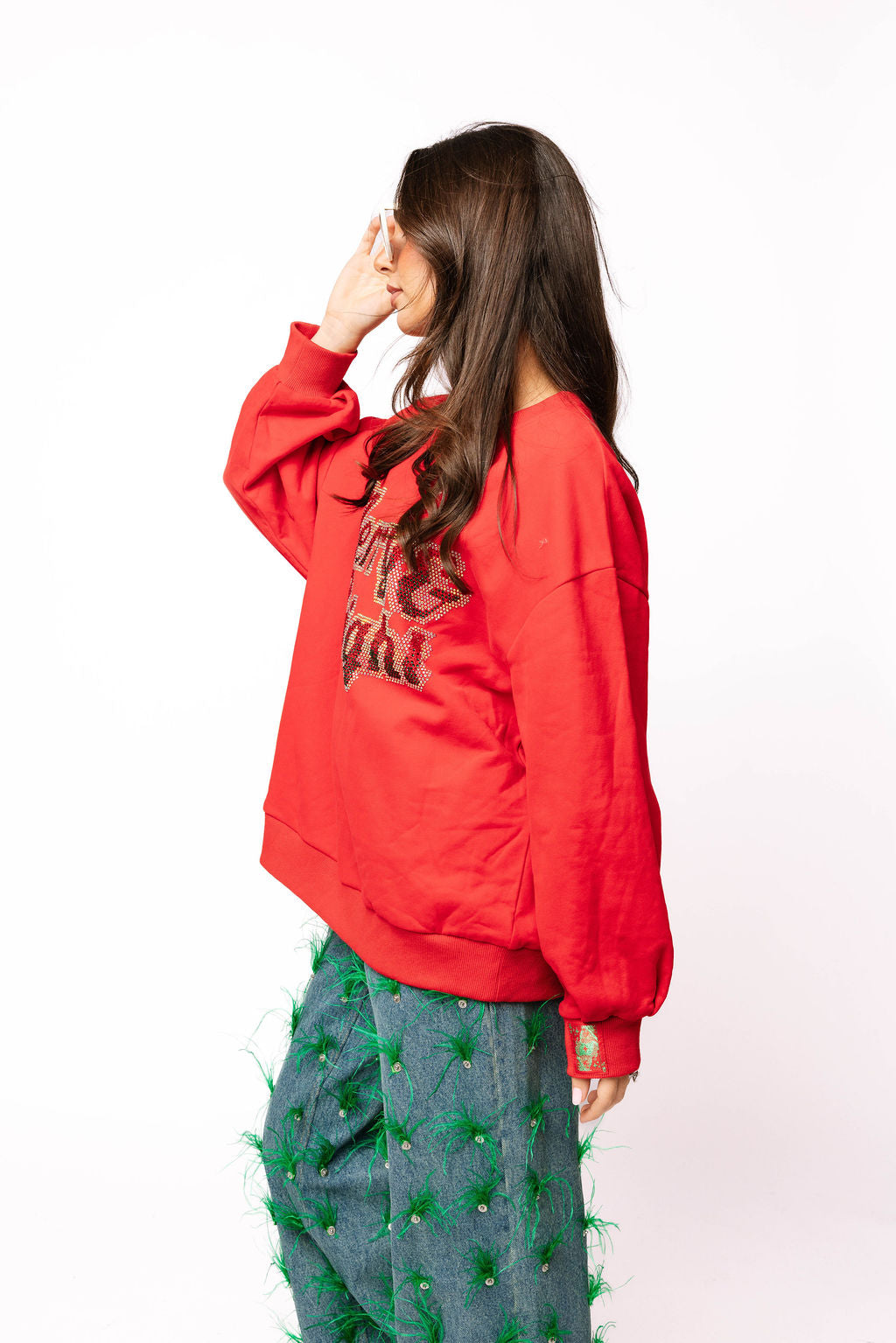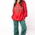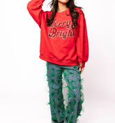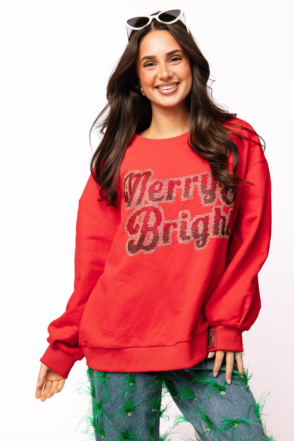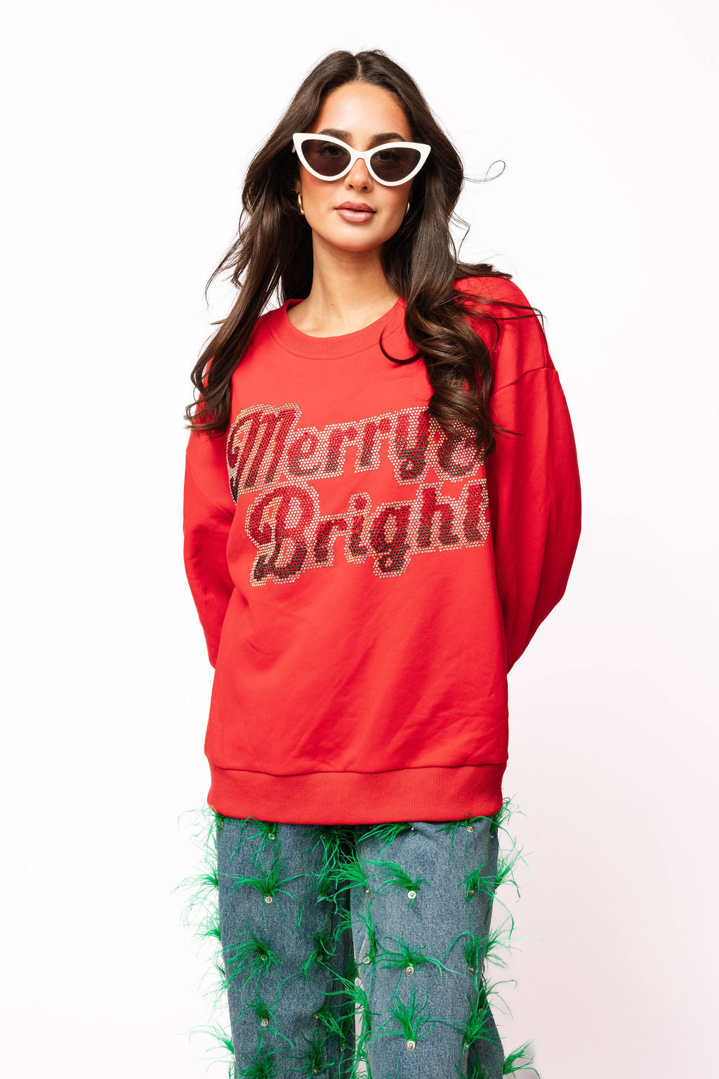 Bring festive cheer to your wardrobe with this playful oversized red sweatshirt, sparkling with rhinestones that spell out "Merry & Bright." Cozy and eye-catching, it’s the perfect holiday top to keep you comfortable while spreading joyful vibes all season long.