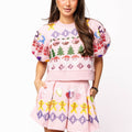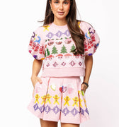 SAMPLE- Light Pink Needlepoint Icon Poof Sleeve Top and Skort Set