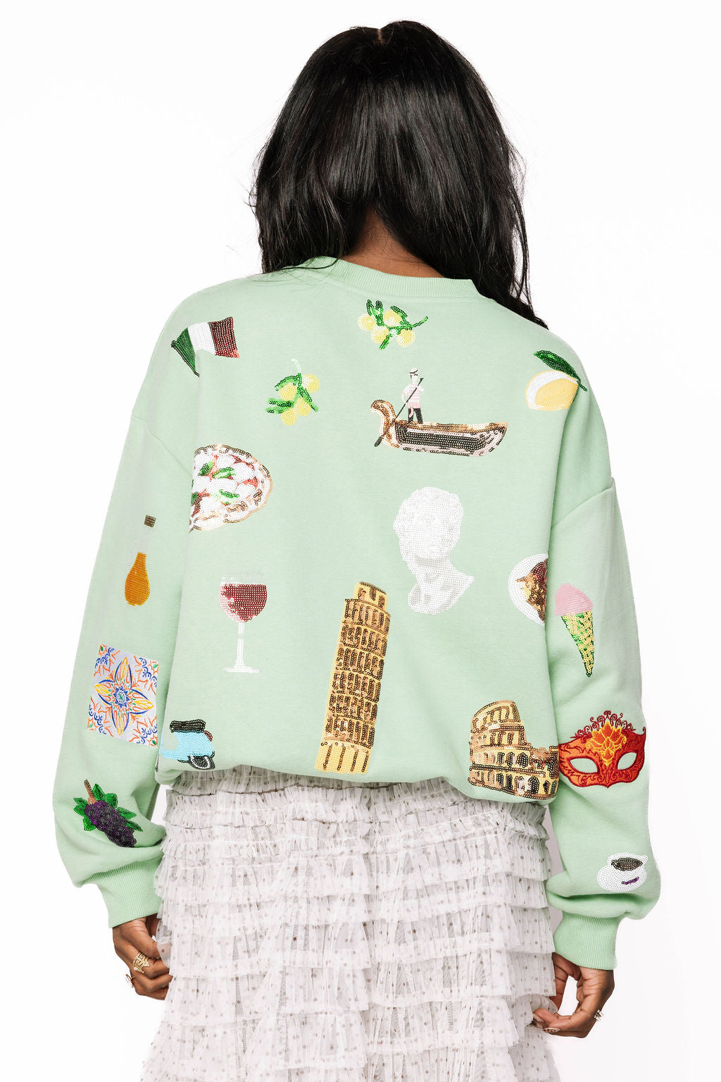 Wrap yourself in wanderlust with this seafoam sweatshirt, adorned with shimmering sequin Roman icons that celebrate la dolce vita. Perfect for travel enthusiasts and Italy lovers, the scattered design brings a touch of Mediterranean magic to your everyday wardrobe. Cozy, sparkly, and undeniably fun—because who says you can't wear your passion for adventure?