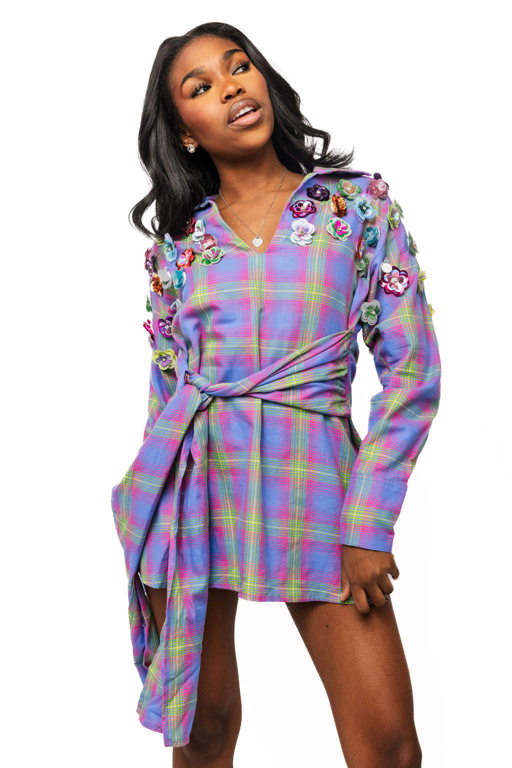 Sample Plaid & Sequin Flower Collar Tie Long Sleeve Dress
