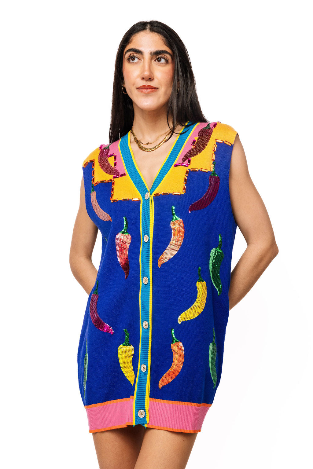 Sample Royal Multi Chili Pepper Knit Button Down Tank Dress
