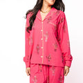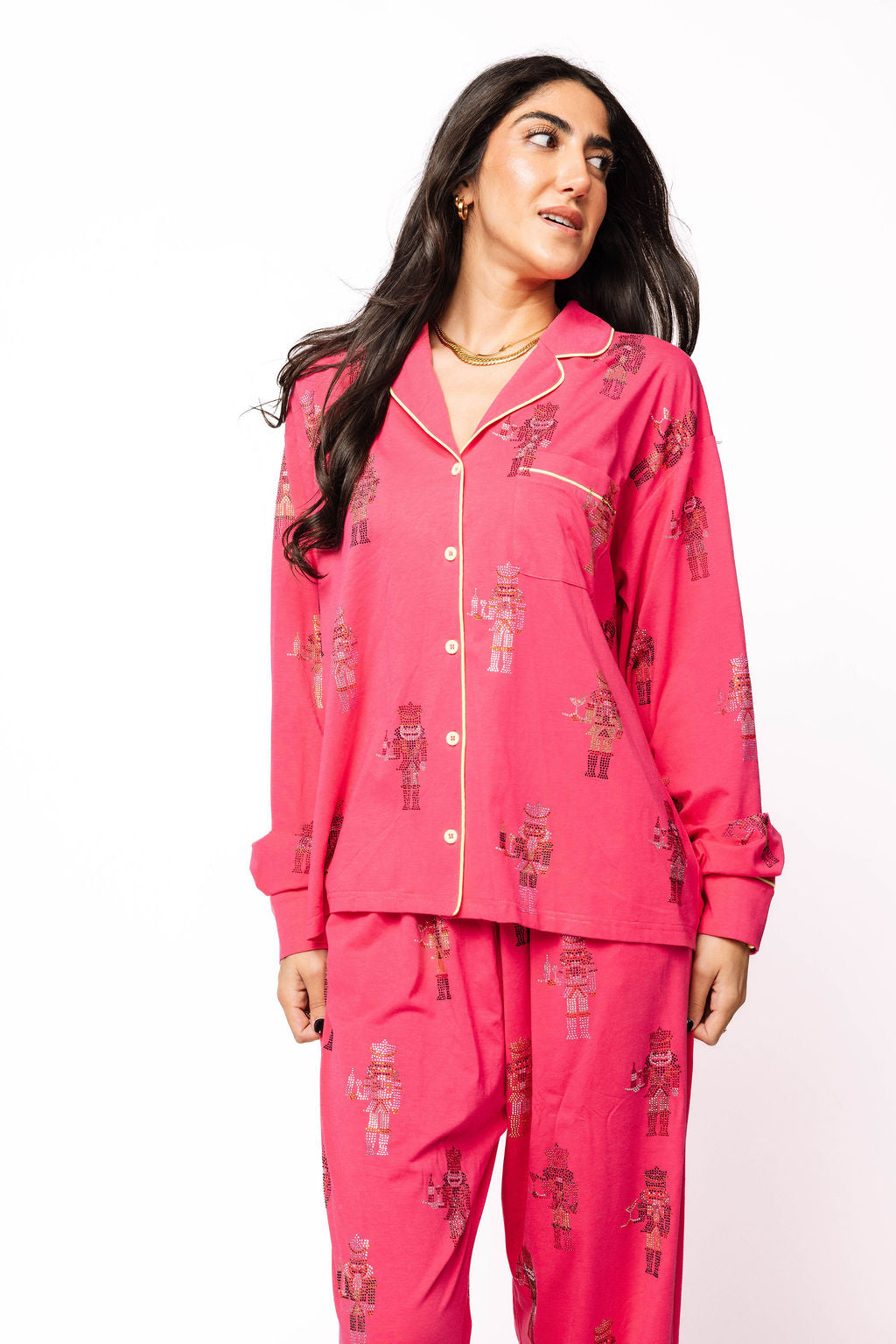 Add a touch of festive fun to your loungewear with this cozy hot pink pajama top featuring a sparkling rhinestone nutcracker design. Perfectly paired with matching pants, it's the playful way to stay comfy and stylish during relaxing days and cozy nights.