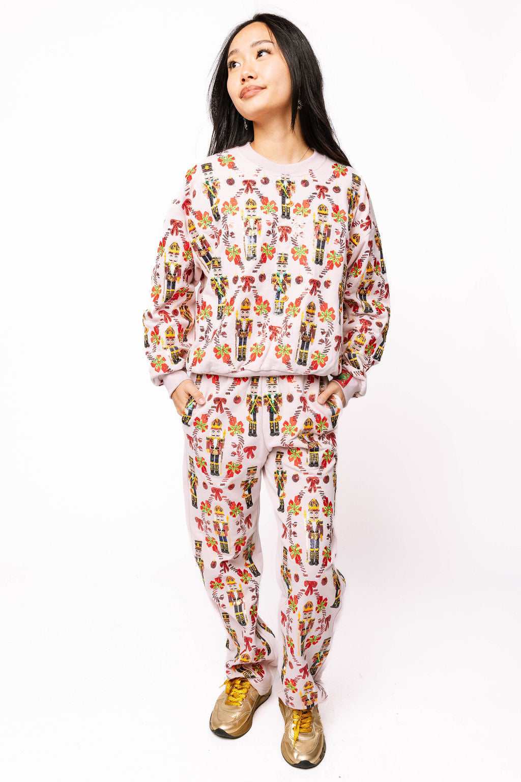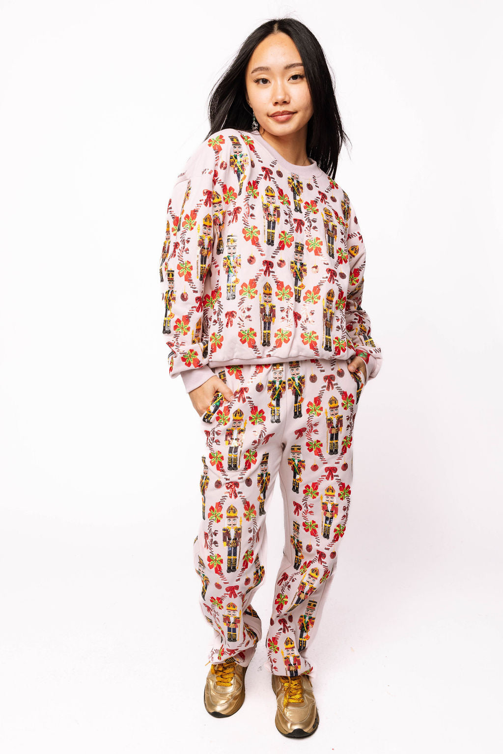These light pink sweatpants bring holiday cheer with whimsical Nutcracker and candy cane details. Cozy and vibrant, they’re perfect for festive lounging or playful winter days. Pair them with the matching sweatshirt to complete a charming, spirited look.