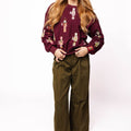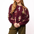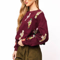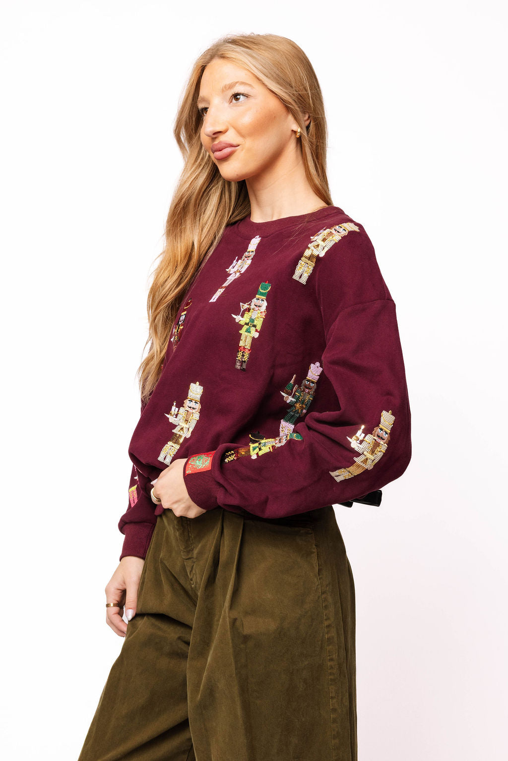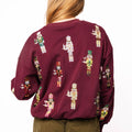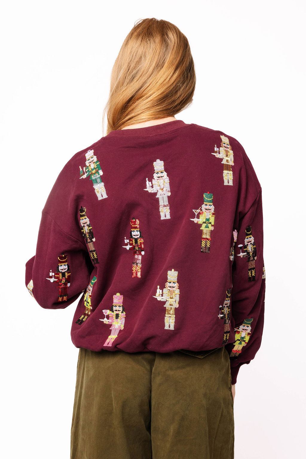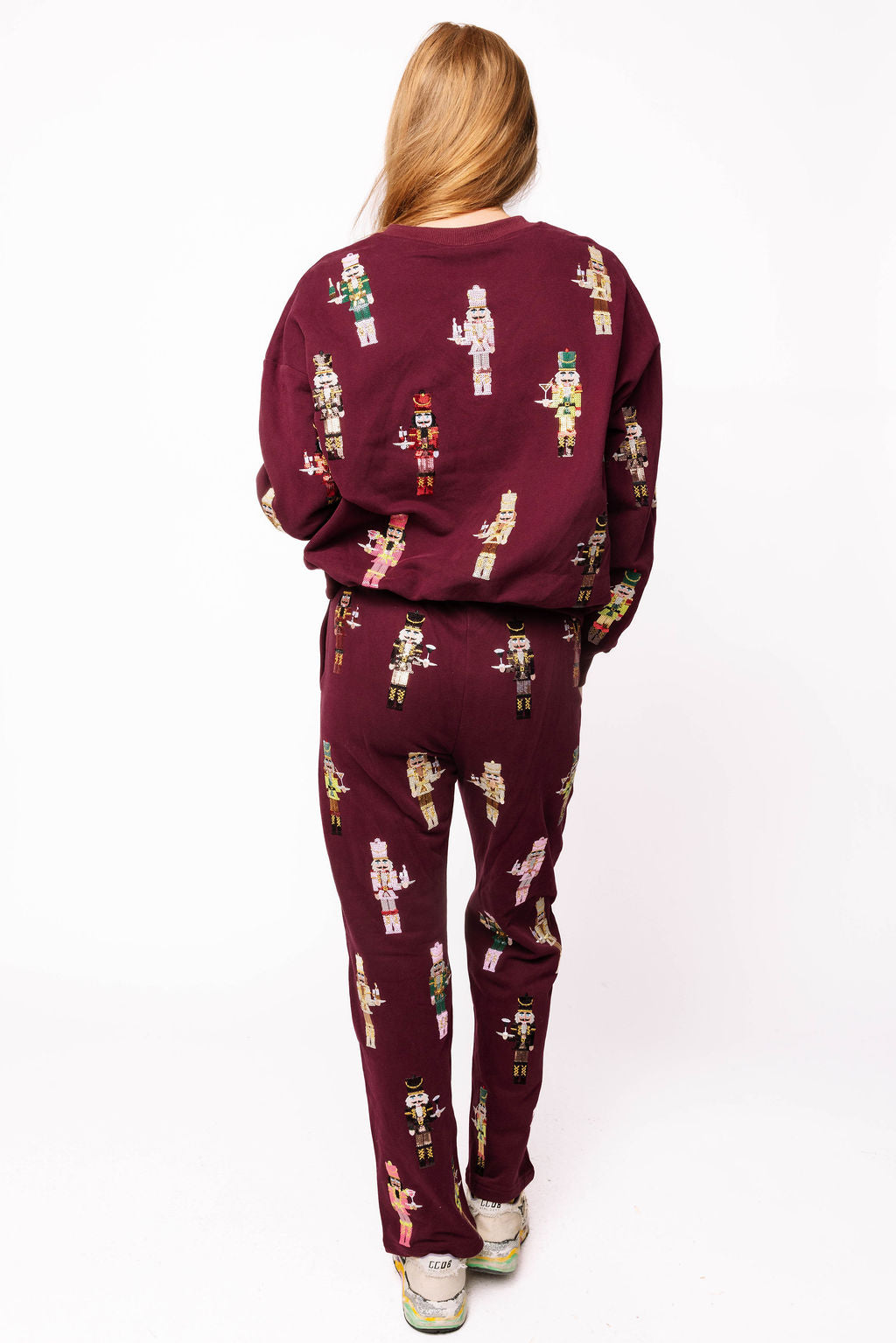 This plum sweatshirt brings holiday fun to your wardrobe with charming nutcrackers serving cocktails on both front and back. Perfectly cozy and festive, it pairs effortlessly with matching sweatpants for a complete playful look that’s ready to party.