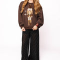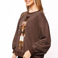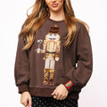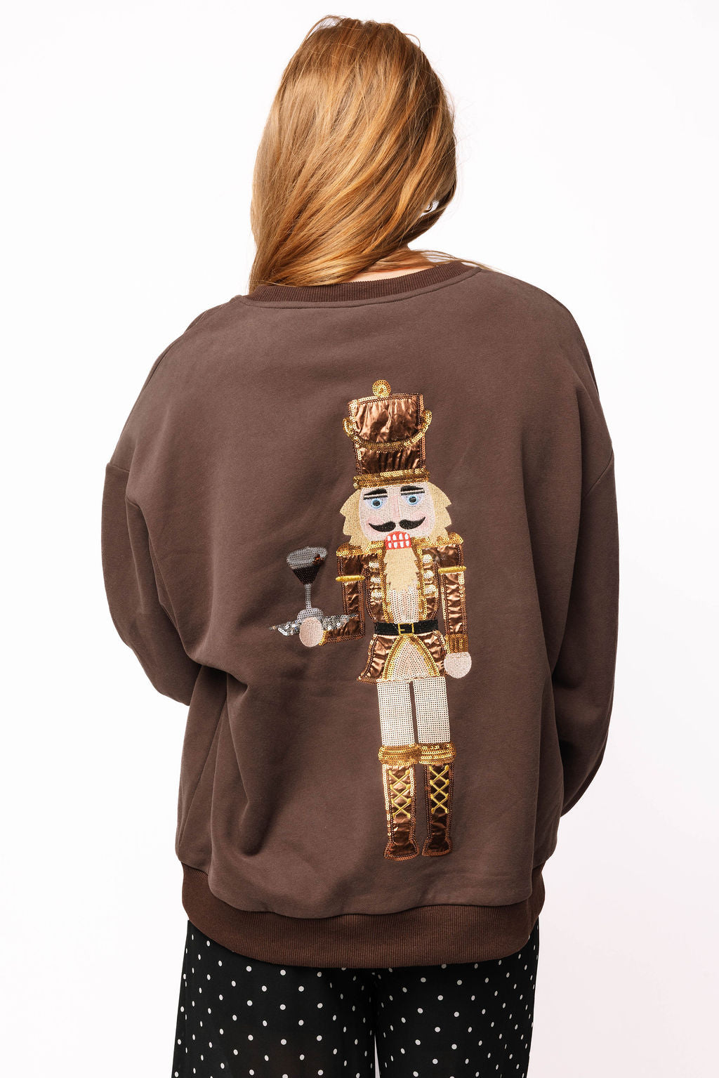 Cozy up this holiday season with this playful brown sweatshirt featuring a festive nutcracker serving an espresso martini. Its slightly oversized fit makes it perfect for relaxed comfort while celebrating your favorite holiday cocktail in style. A fun and festive way to enjoy the season’s spirit!