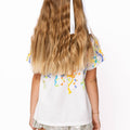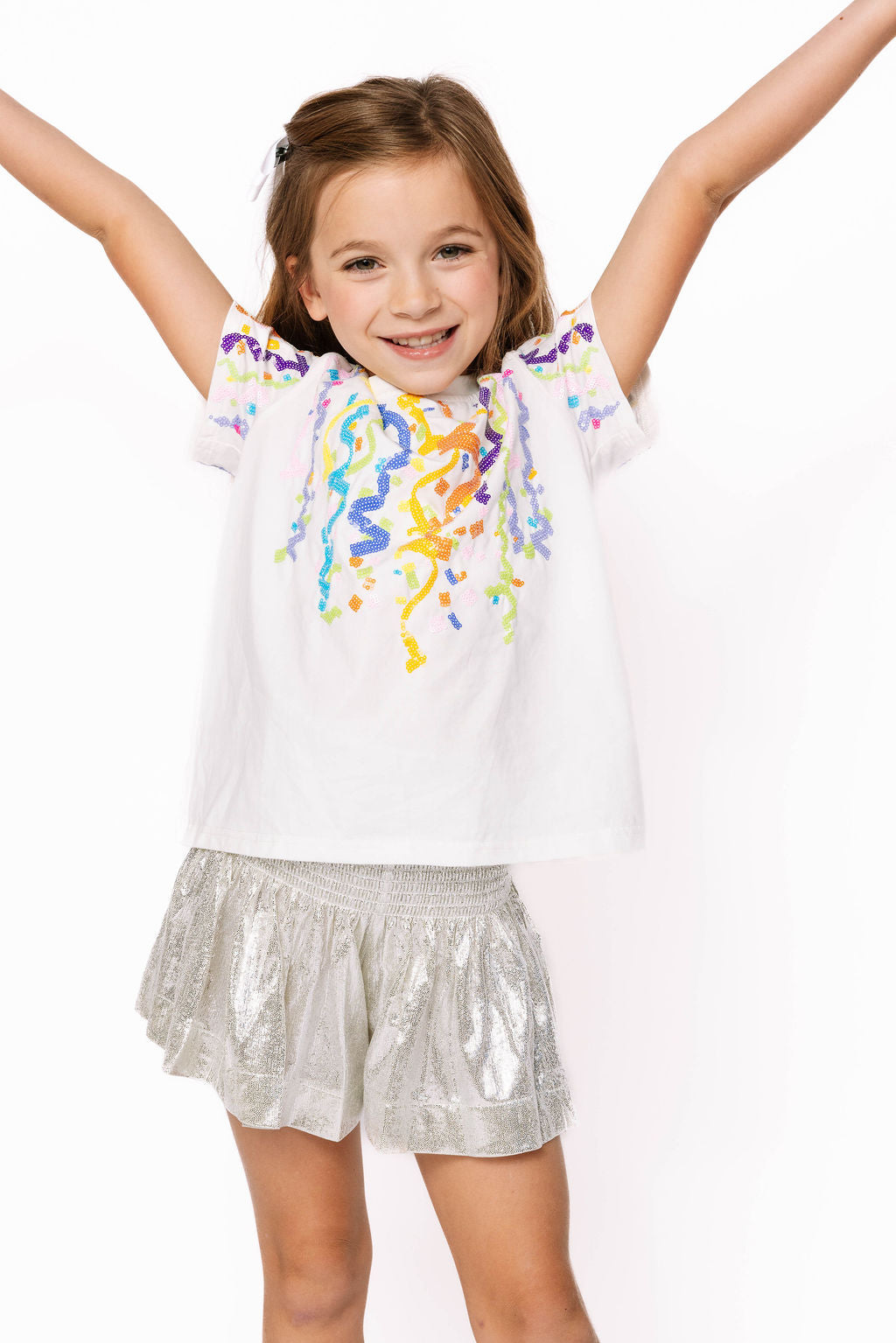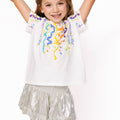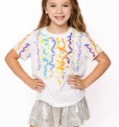 Let your little one shine in this vibrant white tee featuring bold, colorful streamers that dance across the chest. Perfect for playdates, parties, or everyday adventures, this playful piece brings instant fun and movement to any outfit. The soft, comfortable fabric keeps kids happy all day long, while the eye-catching multi-colored design makes getting dressed an exciting part of the day. A must-have for kids who love to stand out and celebrate their sparkly spirit!