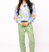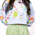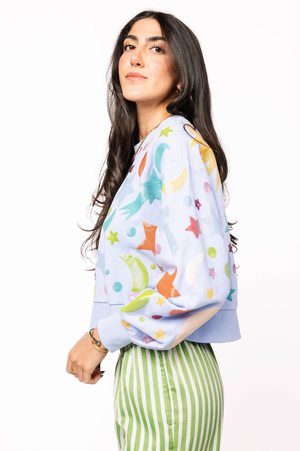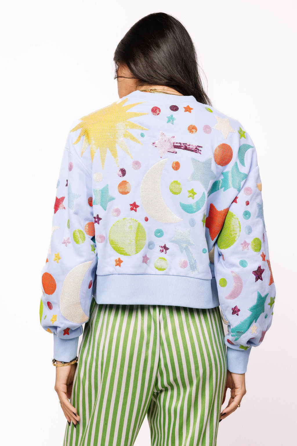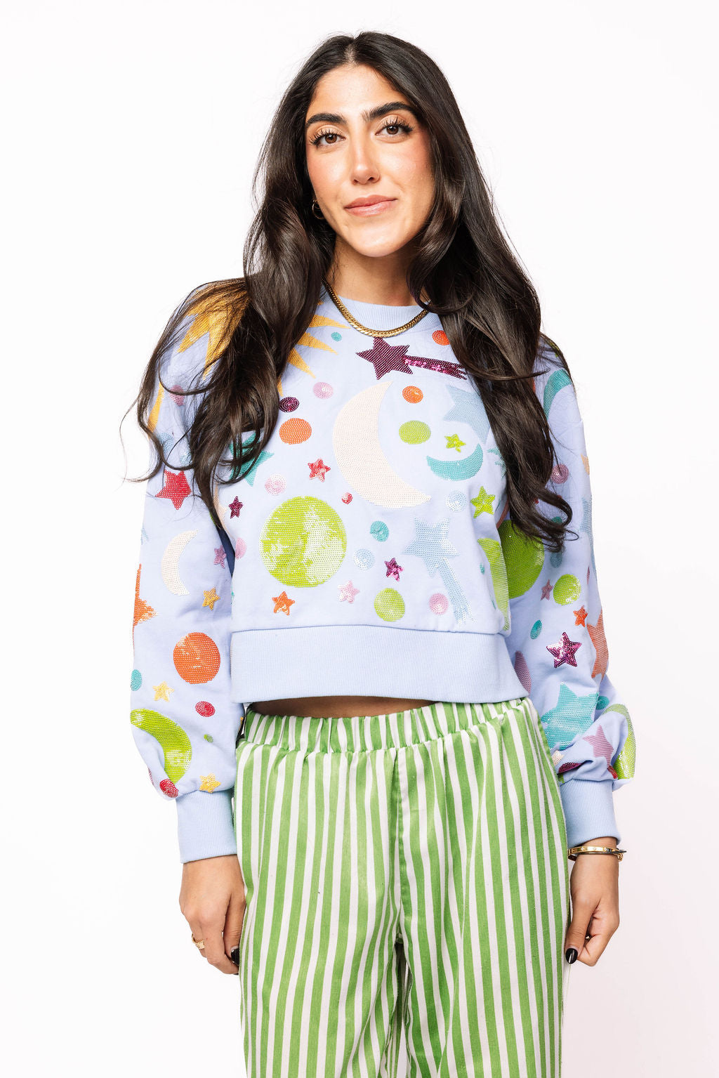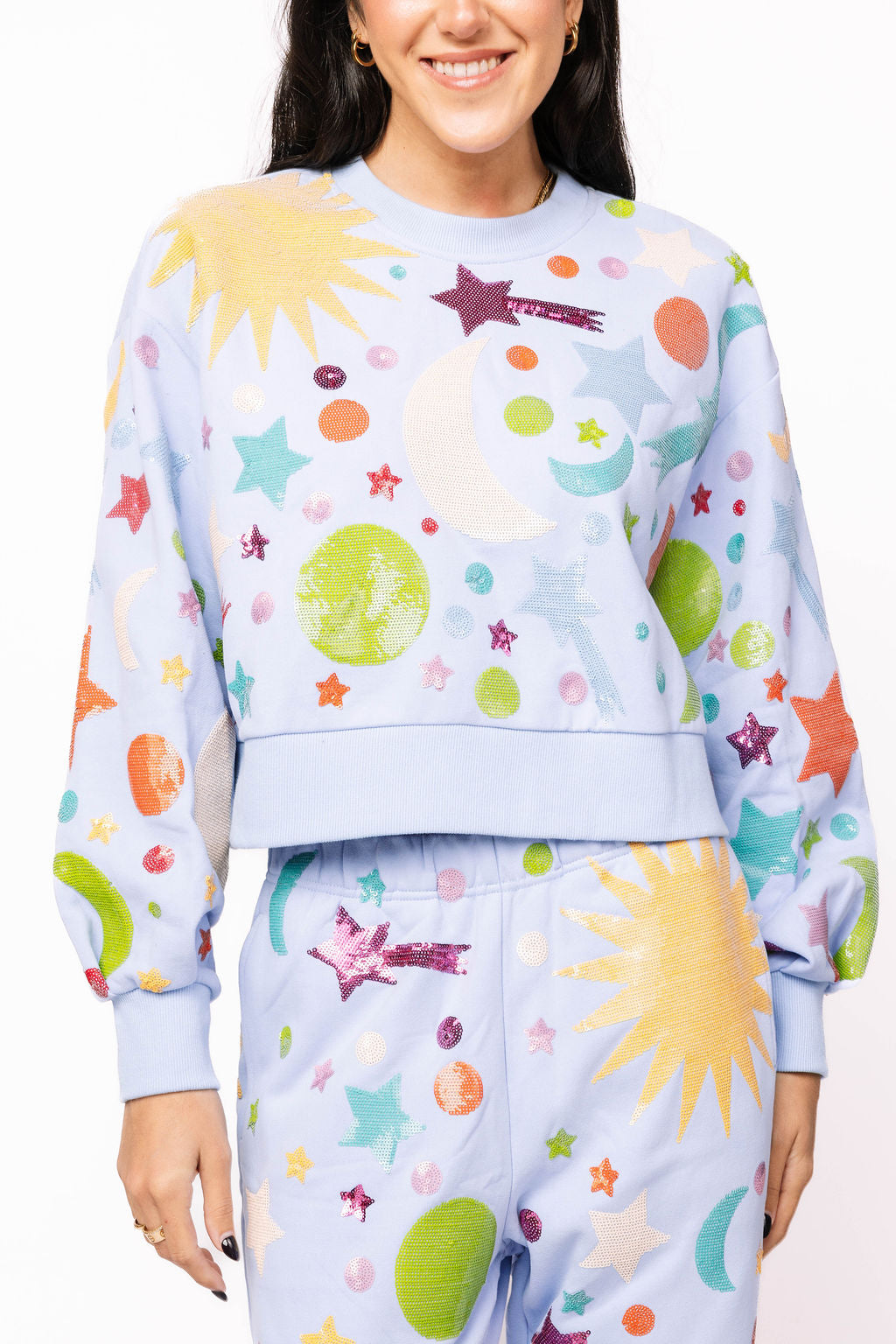 Blast off into style with this cosmic Light Blue Multi Galaxy Sweatshirt! Featuring a mesmerizing galaxy print in vibrant multi-colors against a dreamy light blue base, this cozy pullover is perfect for stargazers and space enthusiasts alike. Soft, comfortable, and totally out of this world, it's your ticket to looking stellar whether you're lounging at home or exploring the universe. Wear your love for the cosmos with pride!