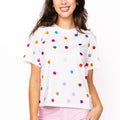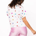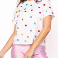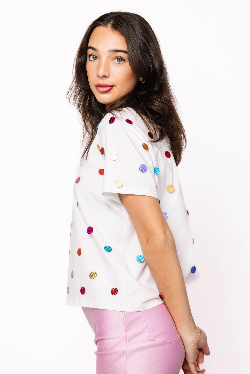 Shine bright like a diamond in this White Multi Sequin Tee! Covered in shimmering sequins in an array of eye-catching colors, this playful top is guaranteed to turn heads and steal the spotlight. Perfect for parties, festivals, or whenever you want to add some sparkle to your everyday look. Lightweight and fun, it's the ultimate way to express your glittery personality and celebrate your inner diva!