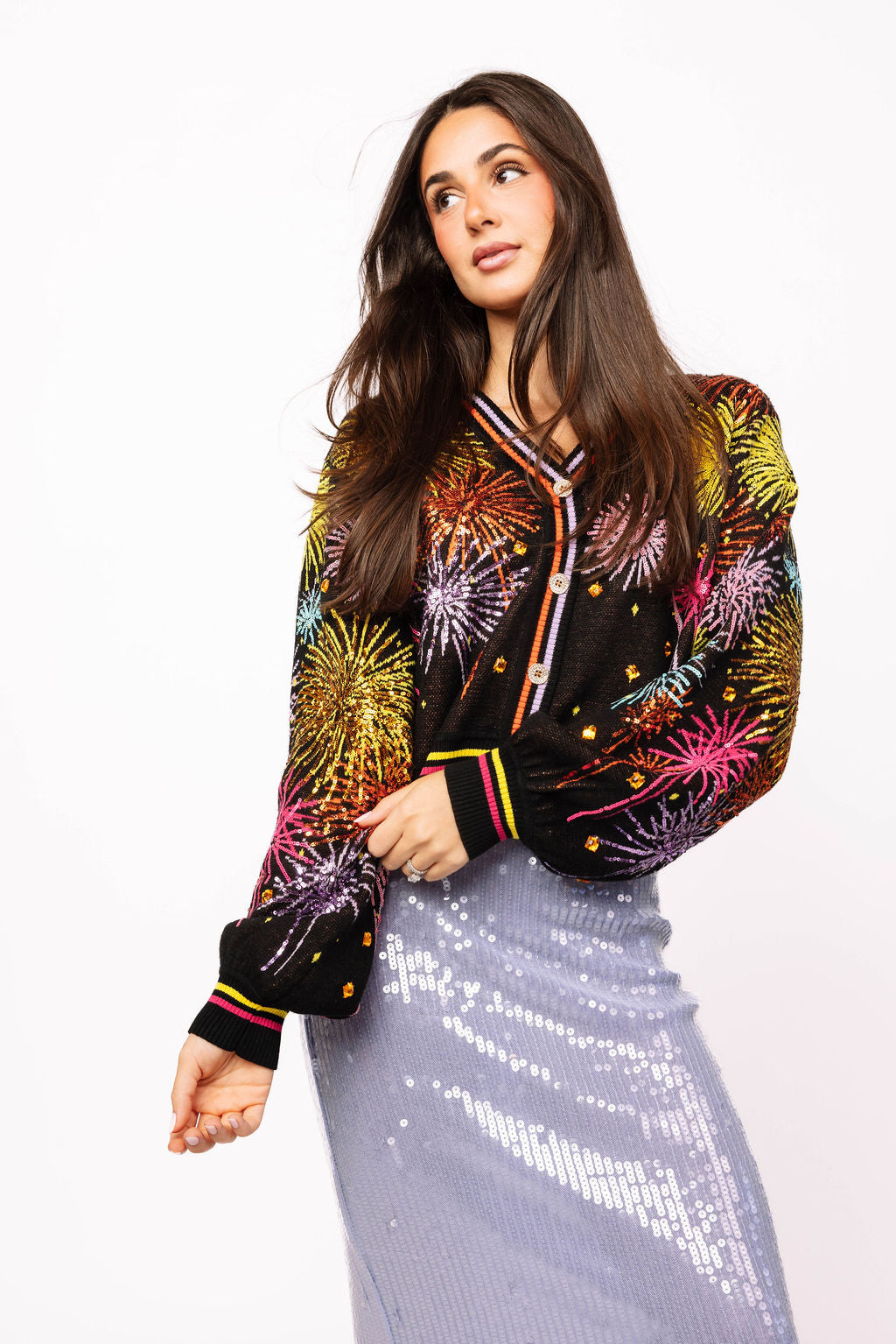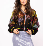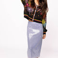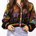 Ignite your wardrobe with this show-stopping black cardigan featuring a dazzling multicolor firework design! Button it up over a sequin skirt for a night out that'll turn heads, or throw it on with your favorite jeans for effortless everyday sparkle. Whether you're going glam or keeping it casual, this versatile piece brings the perfect pop of color and personality to any outfit. Let your style explode with confidence!