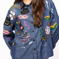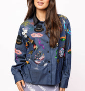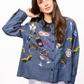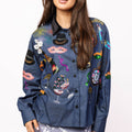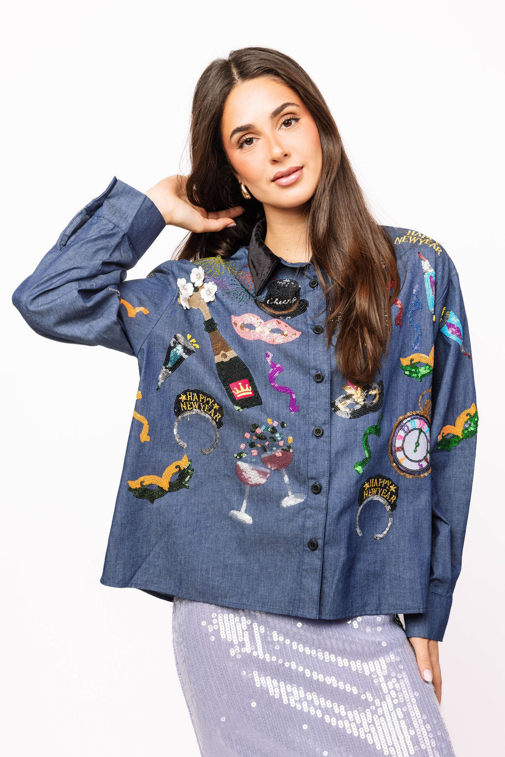 Ring in the new year in style with this vintage-inspired denim button-up featuring a luxe black velvet collar. Adorned with festive NYE icons—champagne flutes, masquerade masks, fireworks, and more—this piece captures all the glamour and excitement of celebration. The classic denim silhouette pairs perfectly with the playful design, making it an instant conversation starter for holiday parties and beyond. Dress it up or down for versatile seasonal style.