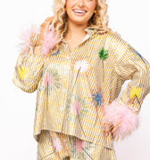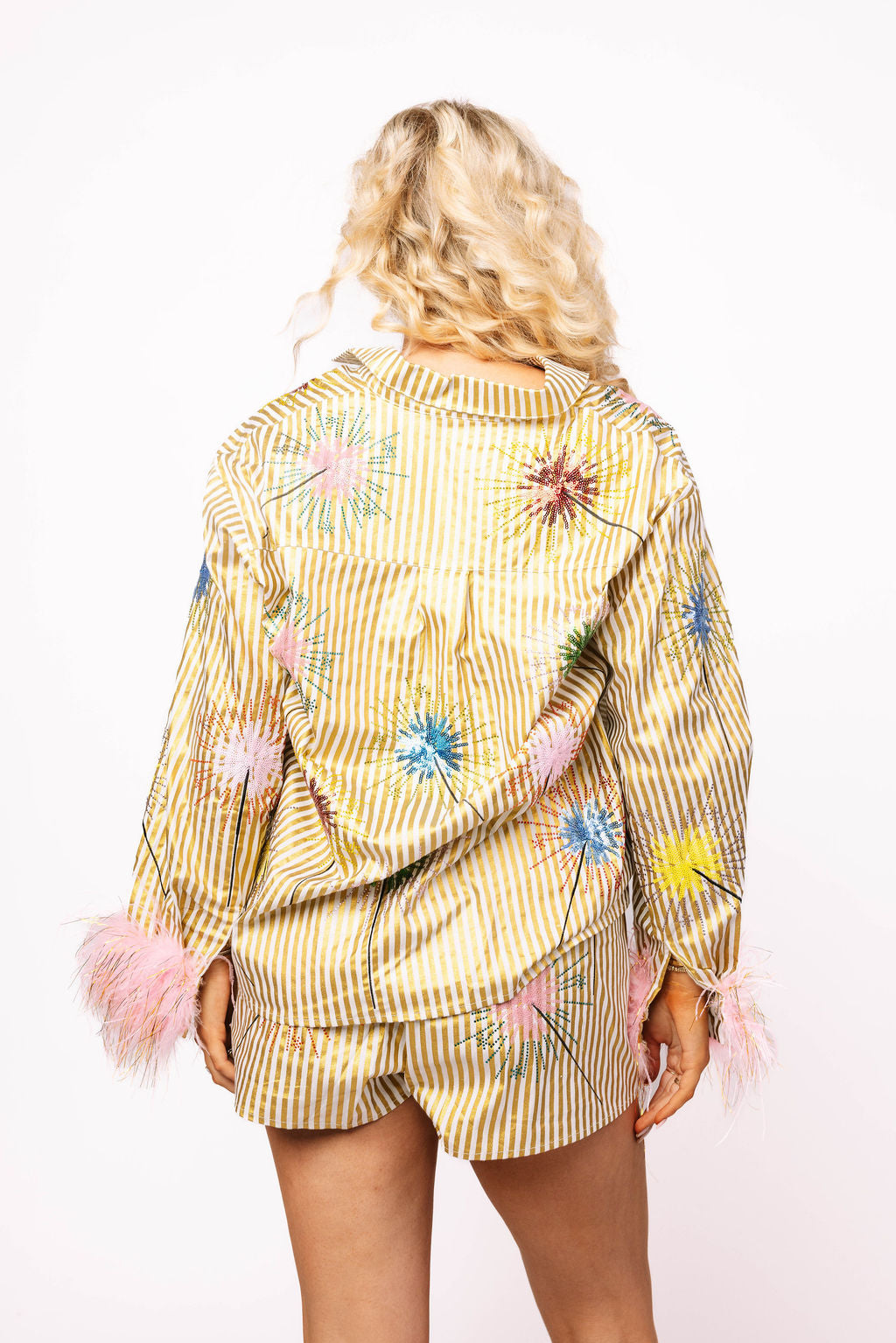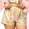 Ring in the New Year in style with these Gold Stripe Multi Sparkler Shorts! Featuring bold gold and white stripes paired with a vibrant multi-colored sparkler design, these shorts are pure celebration. The comfortable elastic waistband keeps you moving through midnight and beyond. Coordinate with our matching top to create the ultimate NYE ensemble that'll have you sparkling all night long!