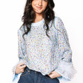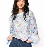 Sample Light Blue Multi Rhinestone Long Sleeve Feather Top