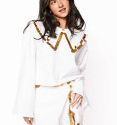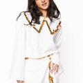 Shine bright like the star you are in this dazzling white and gold paillette collar top paired with a matching skort! The shimmering gold sequins catch every light, while the crisp white base keeps things fresh and fun. Perfect for dance competitions, performances, or any occasion where you want to sparkle and stand out. The coordinated collar and skort set creates a polished look that's equal parts glamorous and playful. Get ready to turn heads and steal the spotlight!