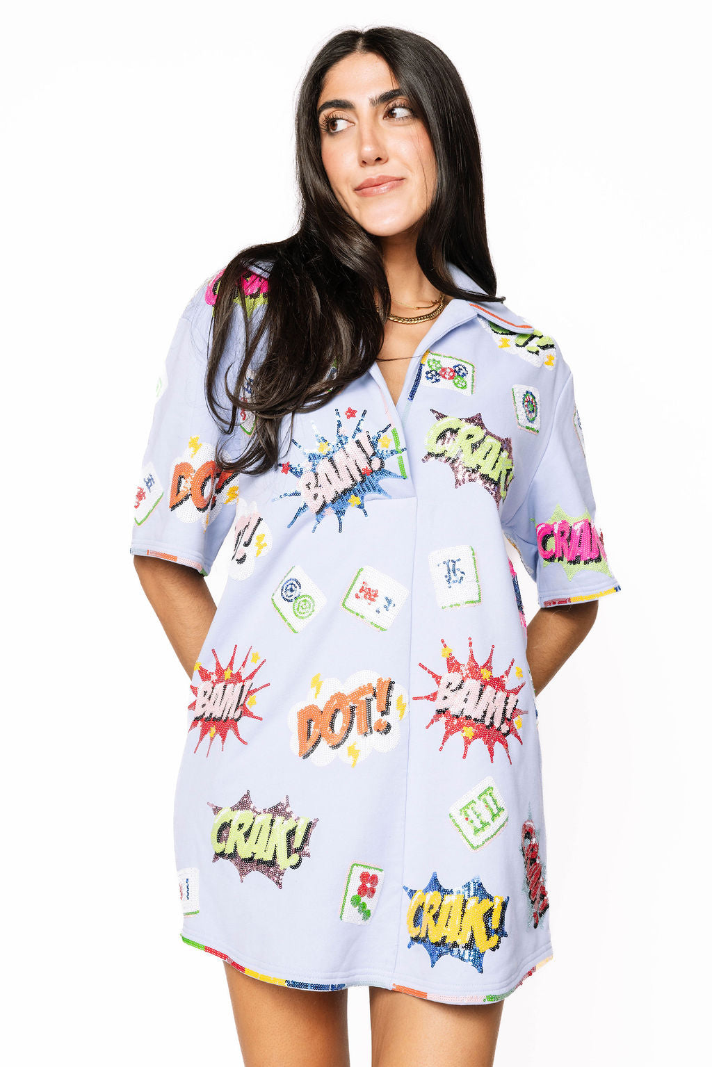 Slip into comfort with this powder blue dress featuring a charming mahjong icon design and playful rainbow trim. Perfect for game nights or casual outings, this cozy piece combines retro-inspired style with a fun, whimsical twist. The structured collar adds a polished touch while the vibrant rainbow accents bring personality to every wear. Soft, breathable fabric keeps you feeling great all day long.