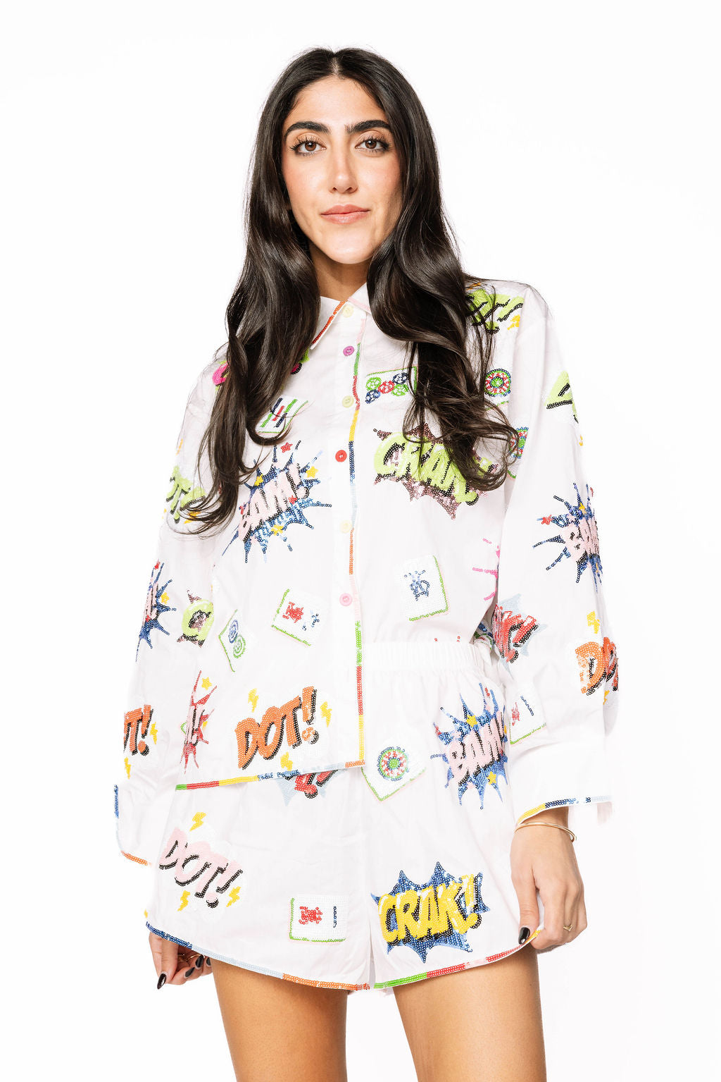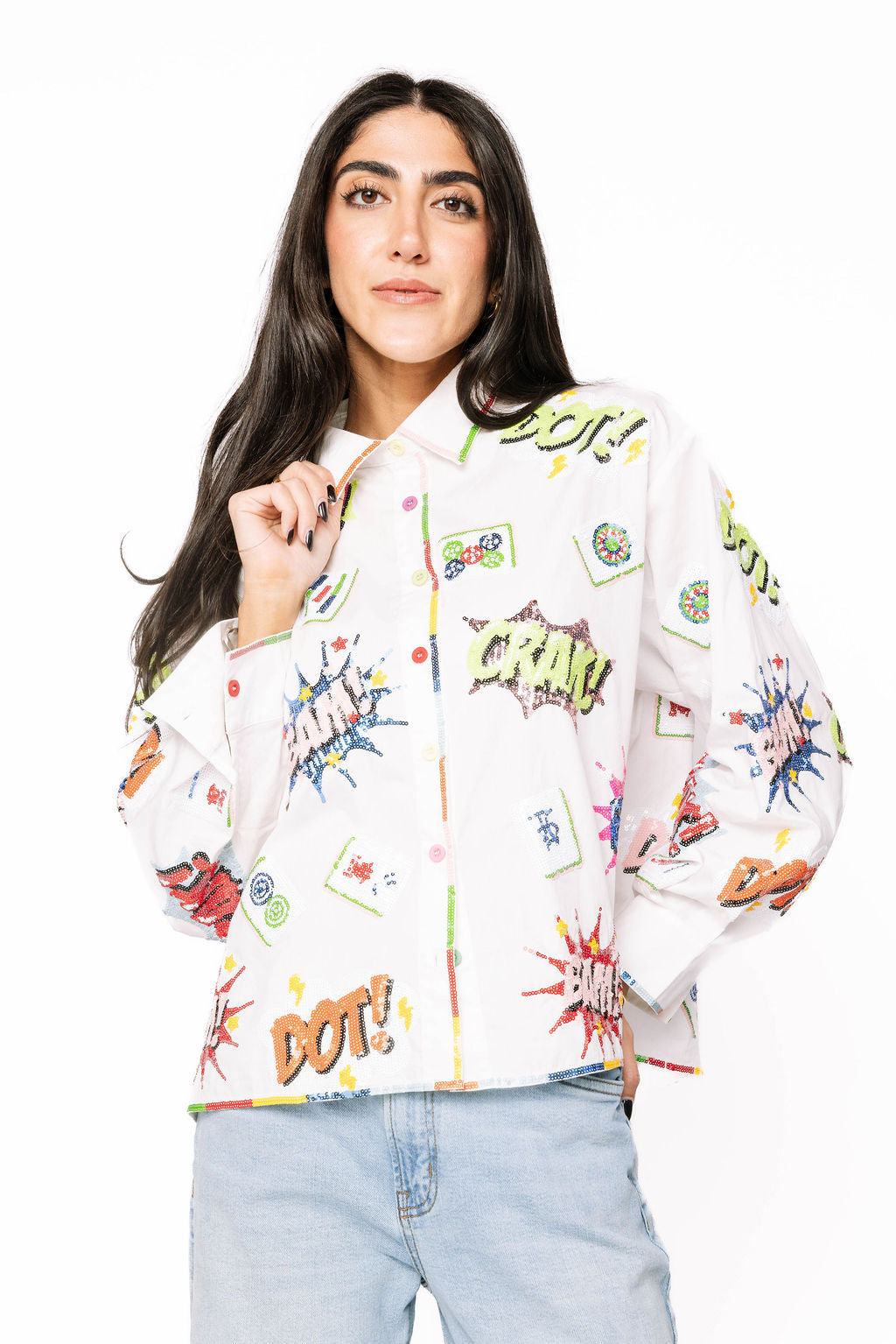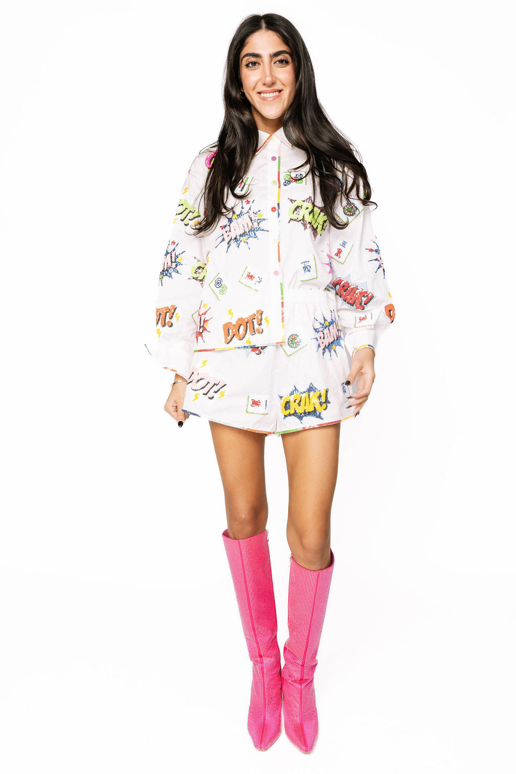 Bring the fun to your wardrobe with this playful collared top featuring a vibrant mahjong icon design and rainbow trim detailing. The crisp button-up style offers a polished yet whimsical vibe, perfect for game nights or casual outings. Mix and match with our coordinating shorts to create a complete, head-turning ensemble that celebrates bold style and personality.