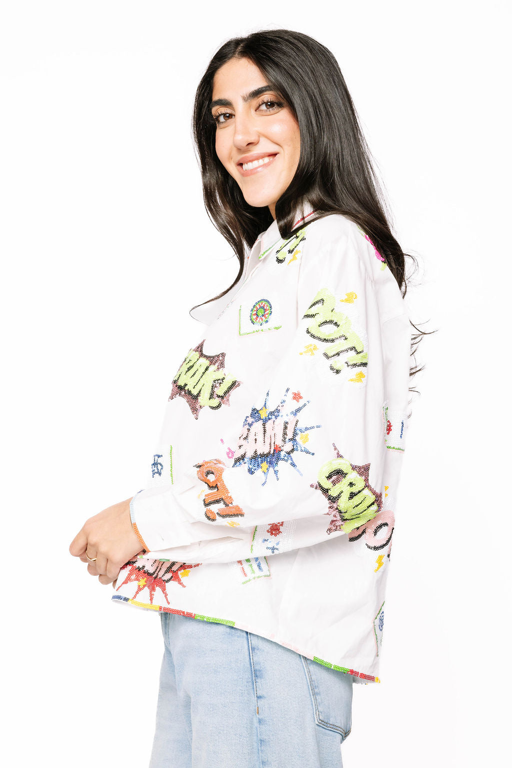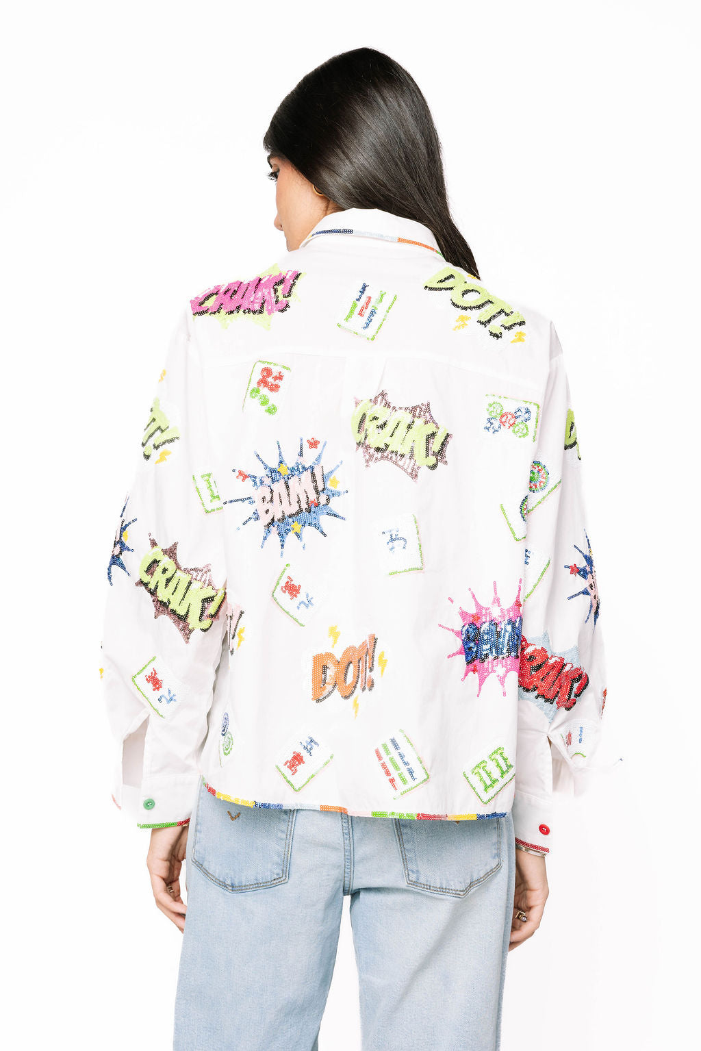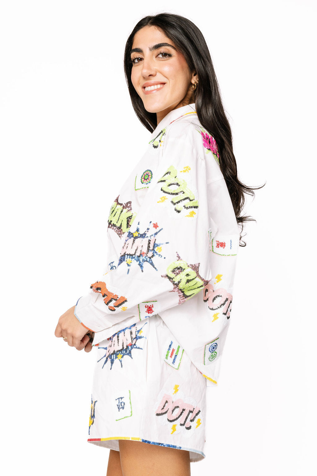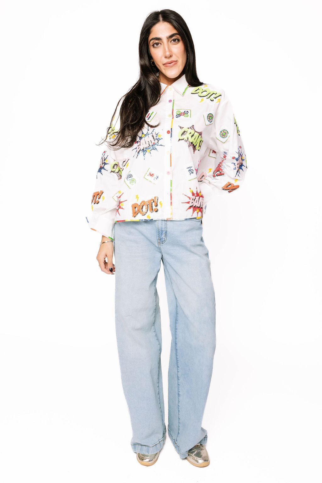 Bring the fun to your wardrobe with this playful collared top featuring a vibrant mahjong icon design and rainbow trim detailing. The crisp button-up style offers a polished yet whimsical vibe, perfect for game nights or casual outings. Mix and match with our coordinating shorts to create a complete, head-turning ensemble that celebrates bold style and personality.