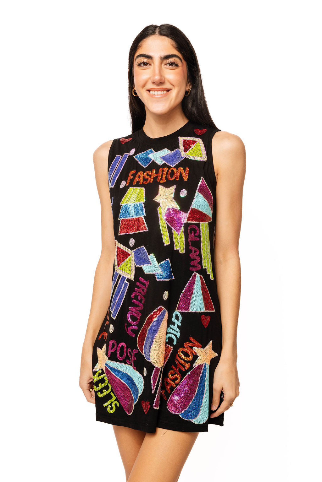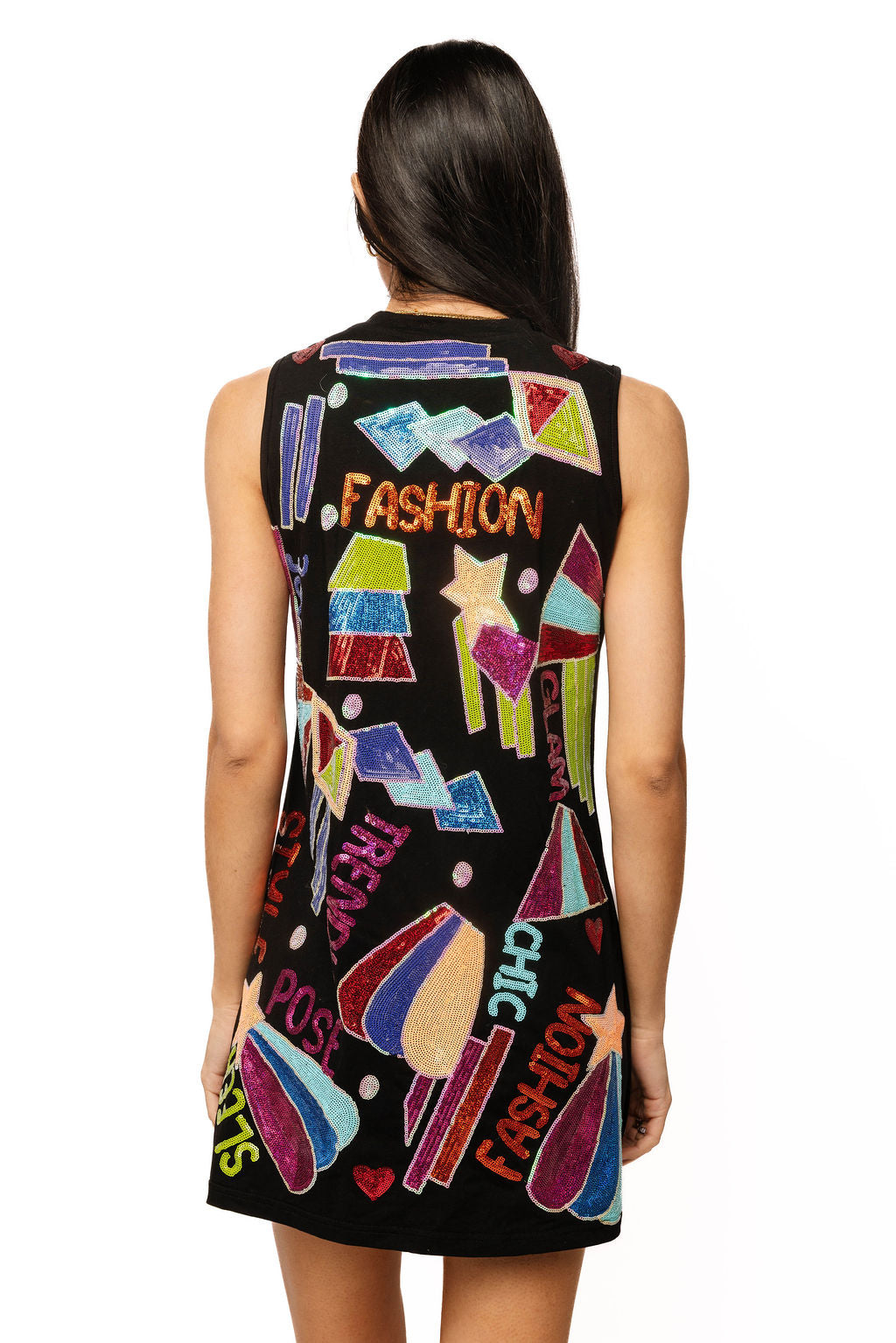 Elevate your casual wardrobe with this sleek black tank dress featuring bold "Fashion" typography and eye-catching geometric icons. The minimalist tank silhouette offers effortless elegance while the graphic design adds contemporary edge and personality. Perfect for warm weather styling, this dress works beautifully layered with jackets or worn solo for maximum impact. The comfortable, quality construction ensures you feel confident and stylish all day long, making it an indispensable piece for anyone who views fashion as a form of artistic expression.
