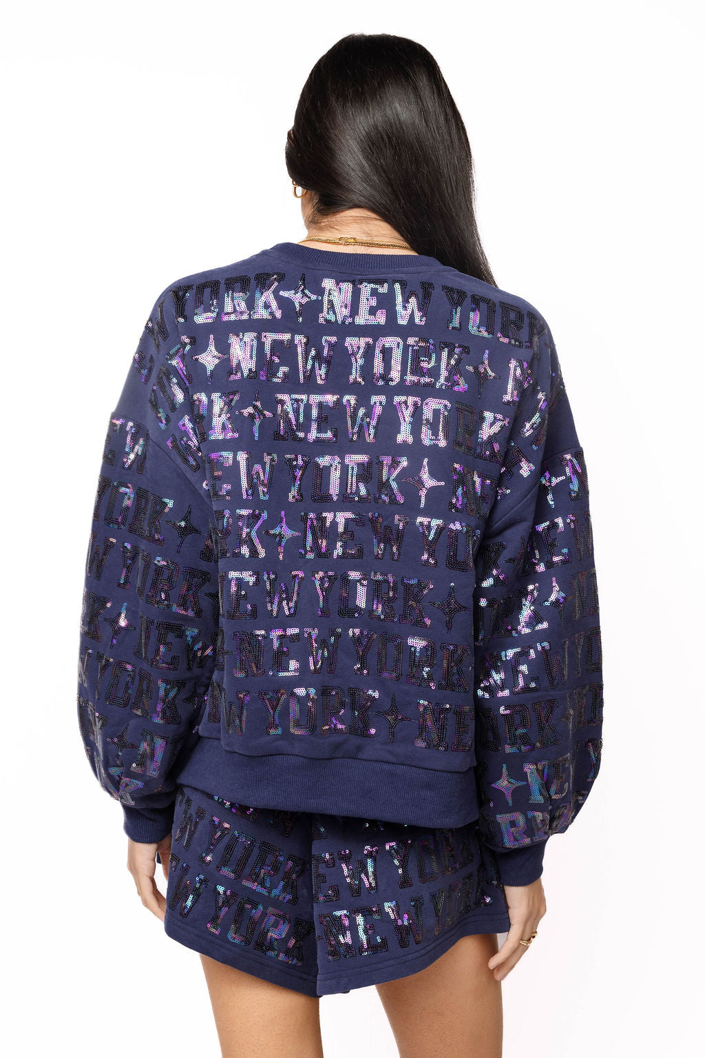 Get ready to make a statement with this navy sweatshirt and short set featuring an all-over "New York" print that screams Big Apple energy. Perfect for those who want to channel urban vibes with a fun, casual edge. The cozy sweatshirt pairs effortlessly with the matching shorts for an instantly coordinated look that's equal parts comfort and style. Whether you're lounging at home or stepping out for a quick errand, this set delivers that laid-back cool factor that turns heads. Embrace your inner city explorer in this playful two-piece combo.