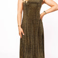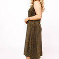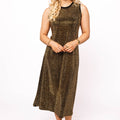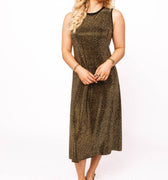 Slip into sparkle mode with this show-stopping black midi dress adorned with shimmering gold rhinestones from top to bottom. Crafted from a buttery-soft, comfortable fabric that moves with you, it's the perfect piece for turning heads at any occasion—whether you're hitting the dance floor or stealing the spotlight at a special event. Dress it up with heels and confidence, and let those rhinestones do the talking!