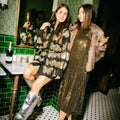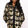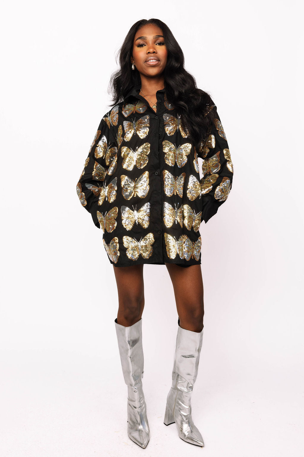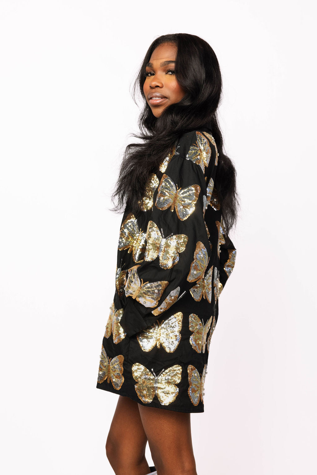 Slip into pure sparkle with this show-stopping black button-up dress adorned with shimmering gold butterfly sequins. Whether you're hitting the dance floor, attending a cocktail party, or making a grand entrance at any celebration, this dress delivers instant glamour and effortless style. The classic black backdrop lets those gorgeous gold butterflies take center stage, while the comfortable cotton blend keeps you feeling fabulous all night long. Dress it up with heels and statement jewelry, or keep it casual with sneakers for a fun daytime vibe. Your new go-to party essential awaits!