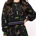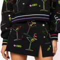 Get ready to turn heads in this Black Multi Rainbow Martini Skort! Crafted from ultra-cozy sweatshirt material, it features vibrant multi-colored martini and olive designs that scream fun and sophistication. The relaxed fit makes it perfect for casual hangouts or themed parties. Pair it with the matching sweatshirt to complete your coordinated party ensemble and show off your playful style. Cheers to comfort and flair!