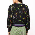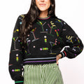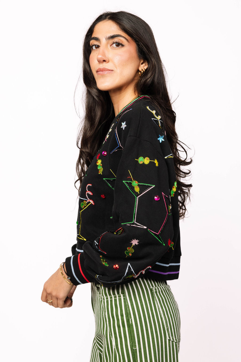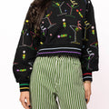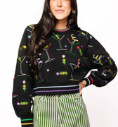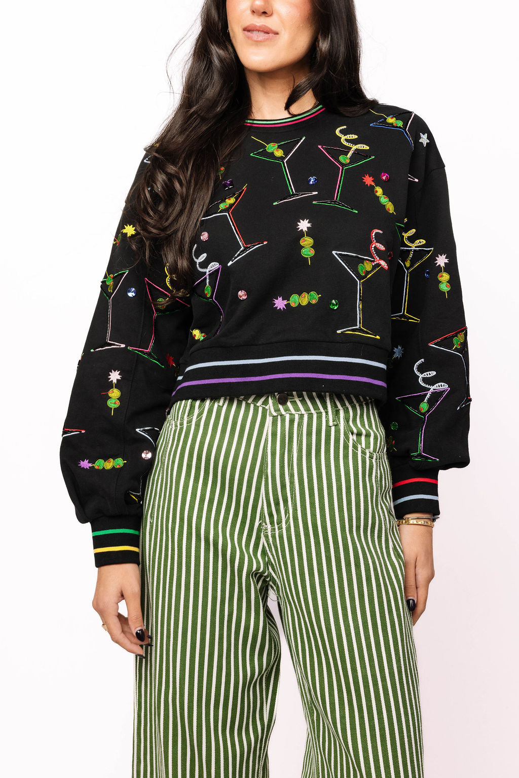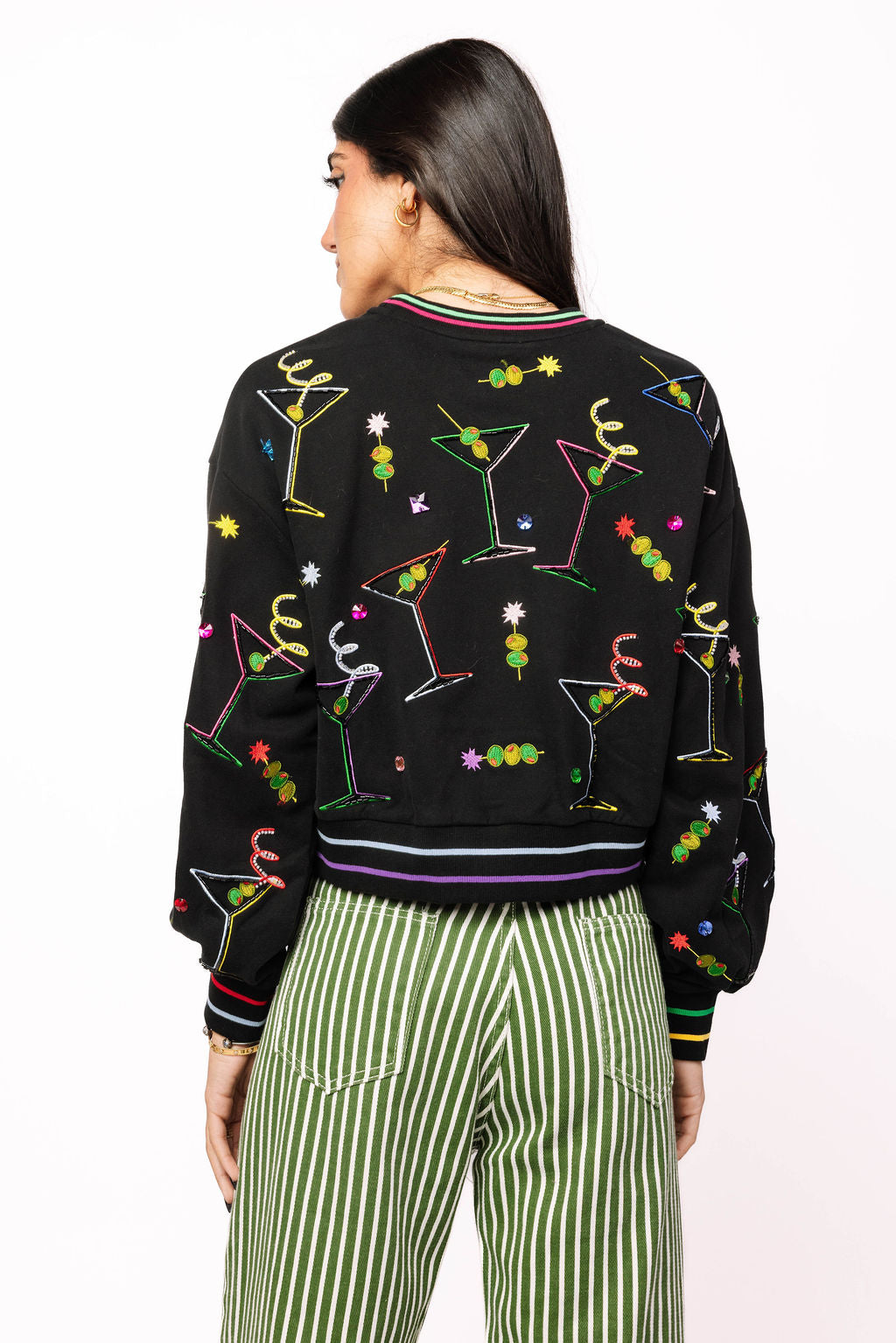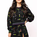 Get ready to mix things up with this black cropped sweatshirt that brings the party vibes. Colorful martinis and olives pop against the dark fabric, while rainbow stripes trim the collar and cuffs for extra flair. Perfect for anyone who loves a good cocktail and even better fashion. Complete the look by pairing it with the matching skort for a coordinated ensemble that's totally on-trend.
