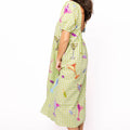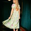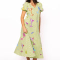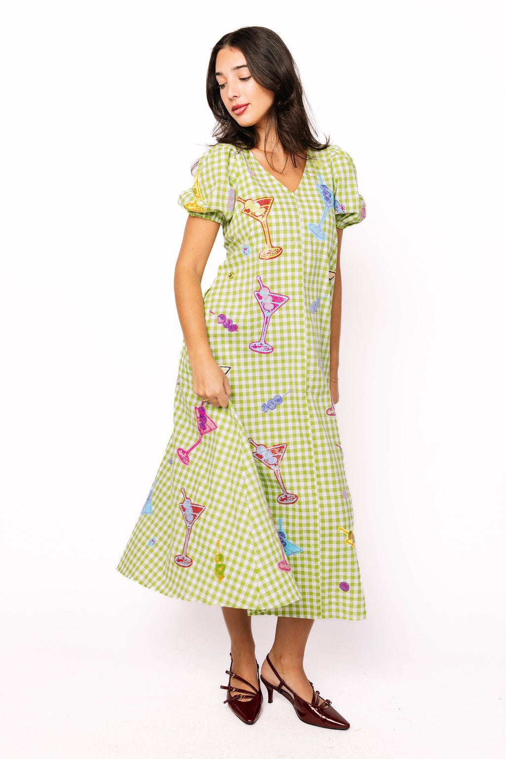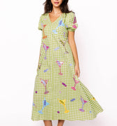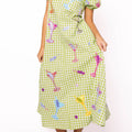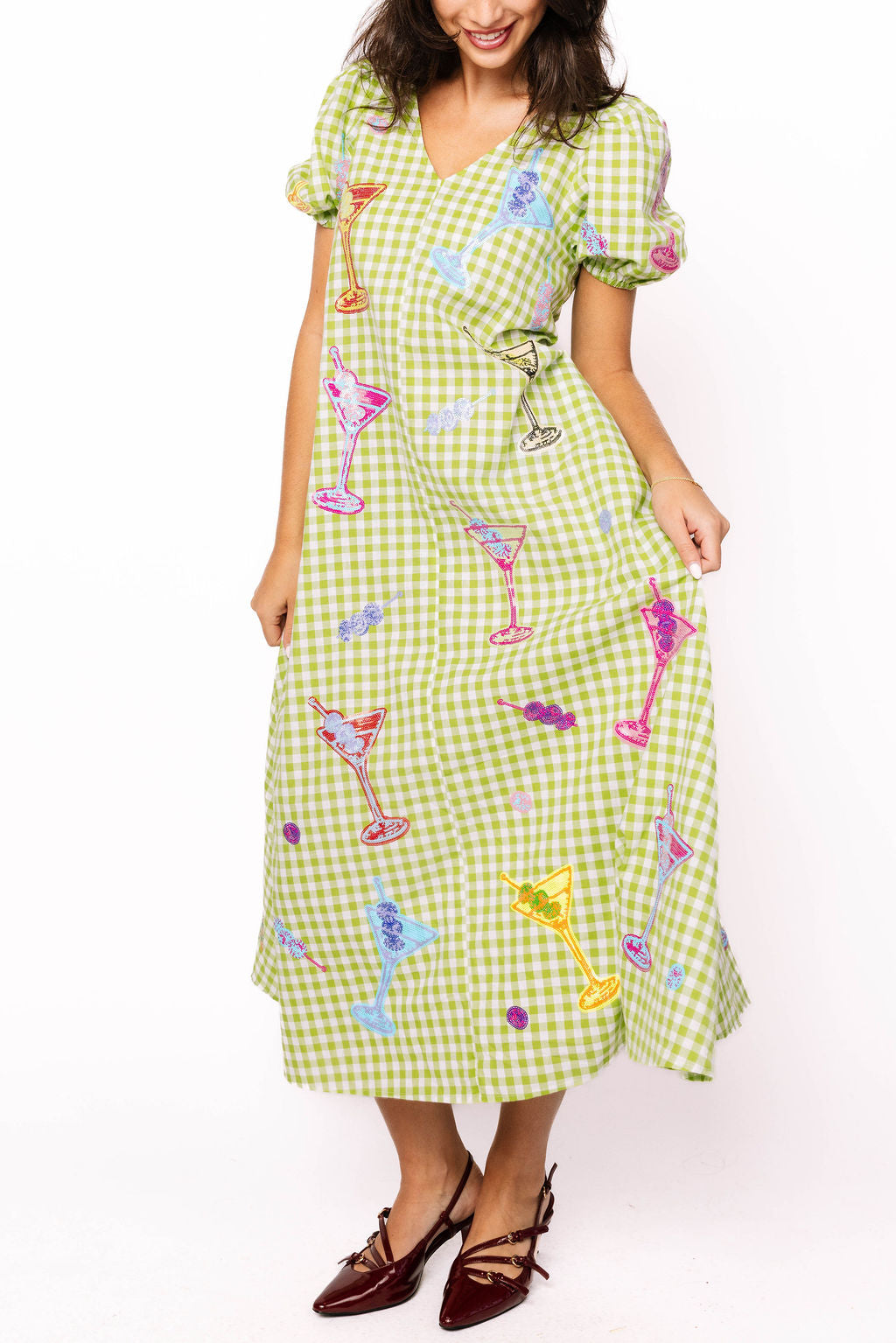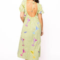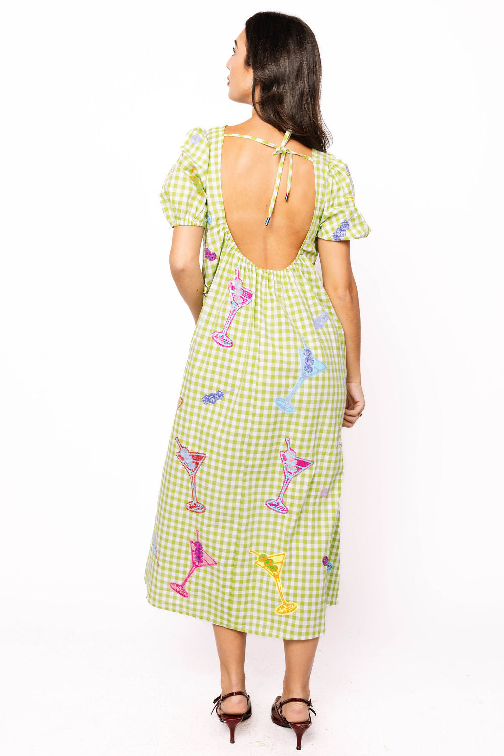 Raise a glass to effortless party style with this flowy gingham midi dress. The crisp green and white colorblock pattern pairs perfectly with a cheeky multi-colored martini print that screams fun. A flattering V-neckline and daring open back create an alluring silhouette, while the relaxed fit keeps you comfortable all night long. Whether you're hitting the cocktail hour or dancing till dawn, this dress delivers the perfect blend of playful sophistication and carefree elegance.