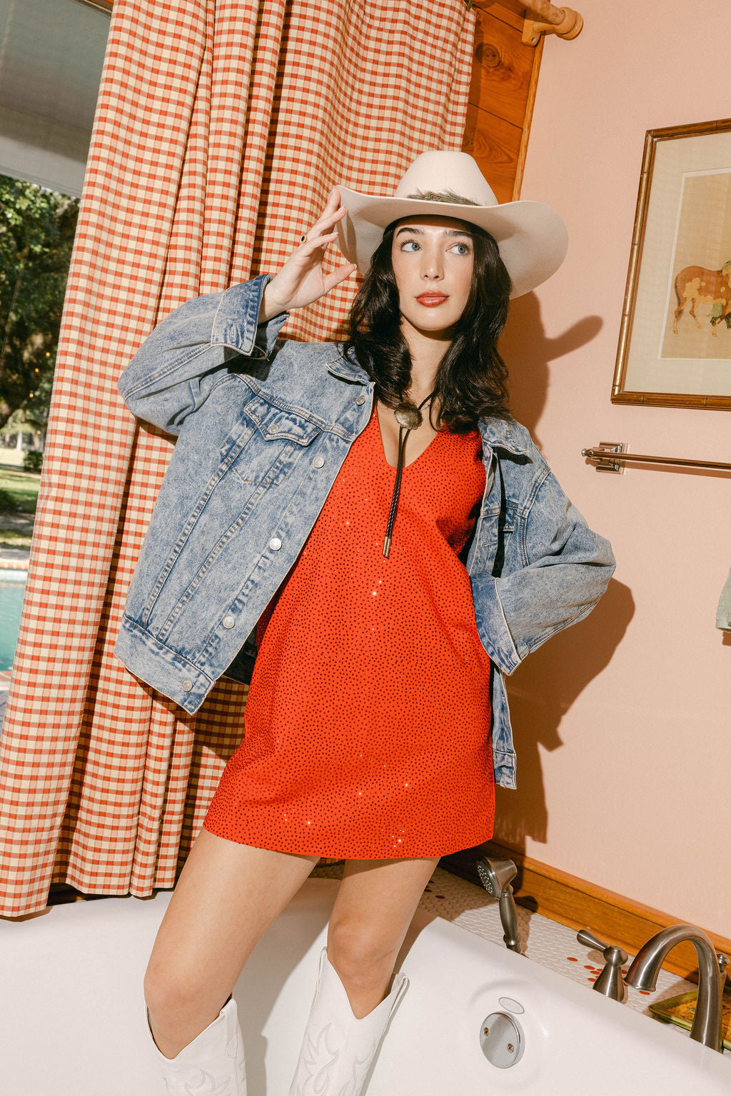 Slip into pure sparkle with this show-stopping red tank dress! The plunging V-neckline flatters every figure, while rhinestones cascade across the entire silhouette for maximum dazzle. A convenient back zipper makes getting ready effortless. Perfect for nights when you want to turn heads and catch the light with every move—because sometimes less fabric means more glamour.