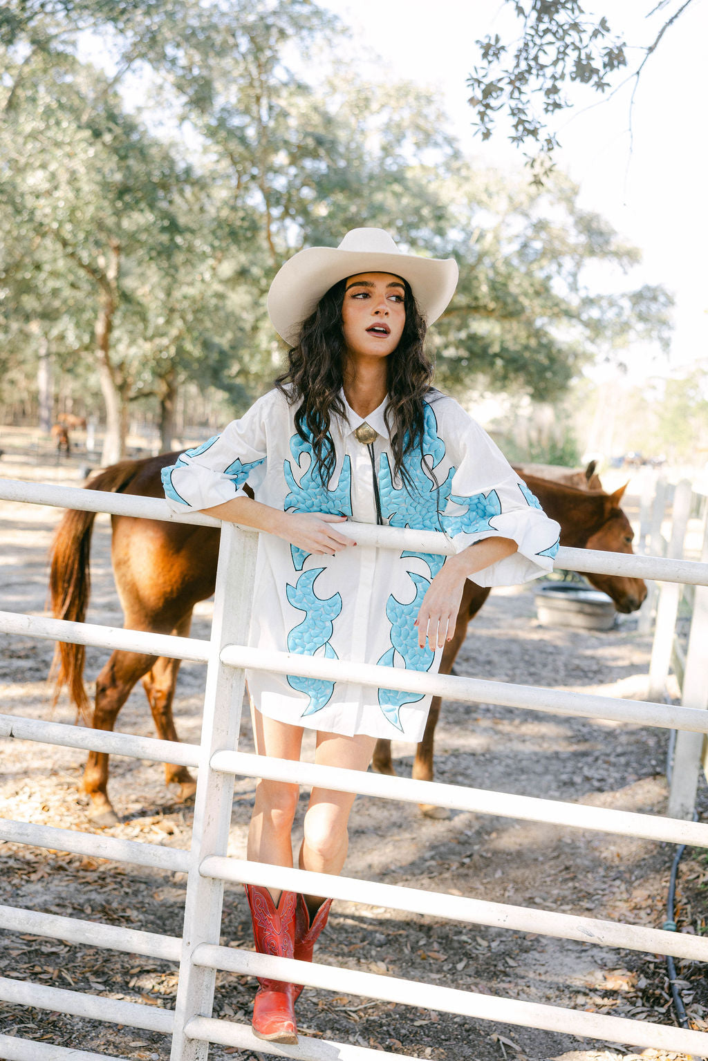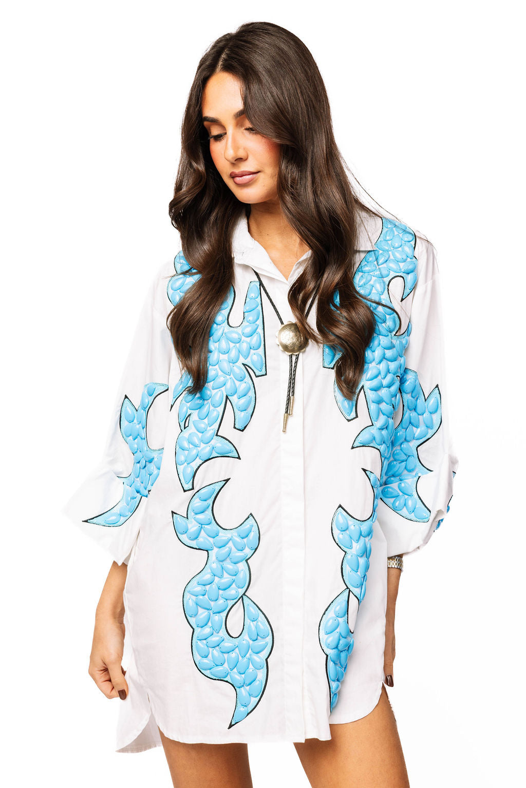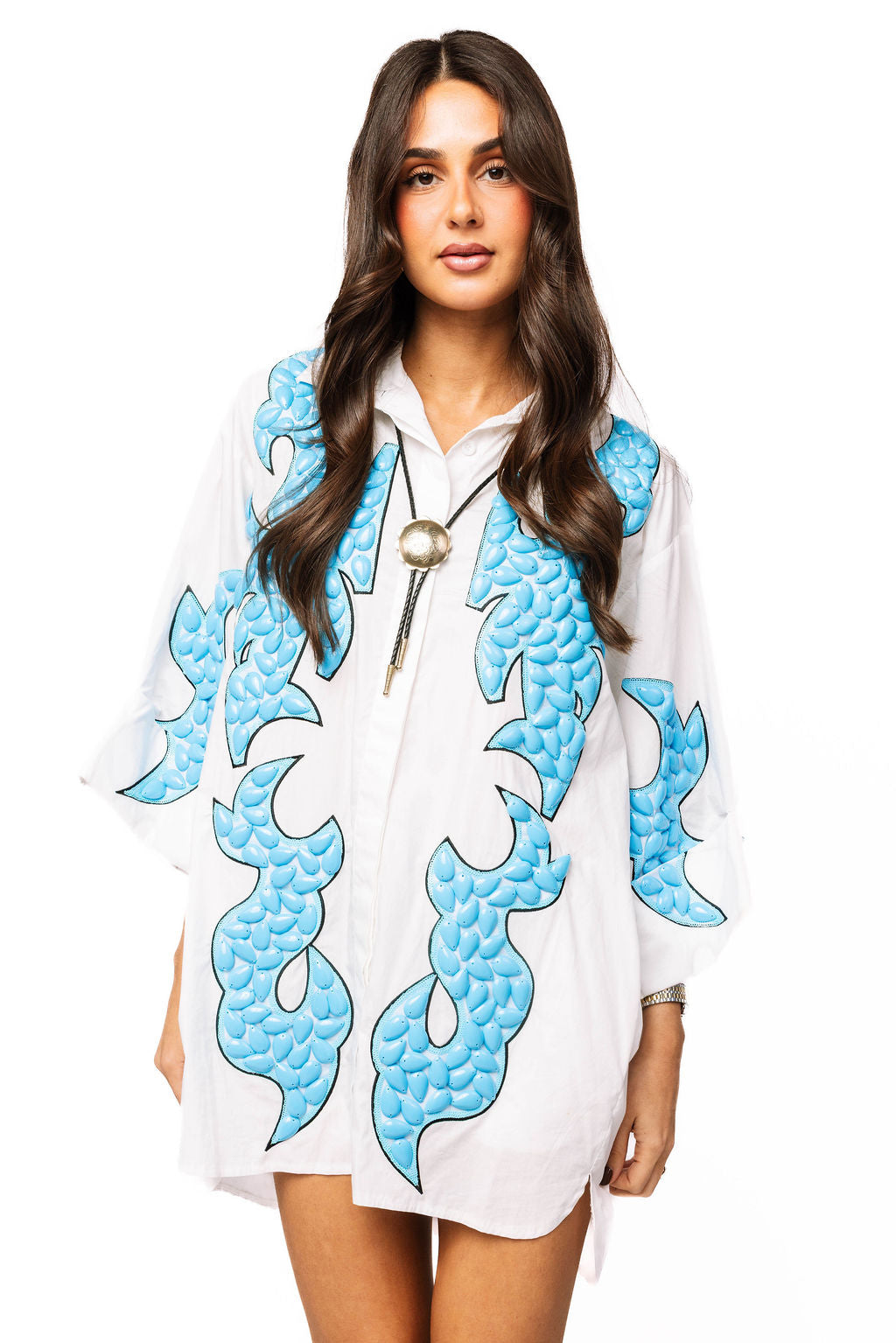 Elevate your casual wardrobe with this stunning white cotton tunic that's anything but basic. Featuring a jeweled turquoise design that catches the light beautifully, this button-up style brings instant sparkle to your everyday look. The relaxed tunic silhouette offers comfort and versatility, perfect for pairing with your favorite jeans, leggings, or layering over a slip dress. Whether you're heading to brunch or running errands, this piece adds just the right amount of glamour to make you feel like the queen you are.