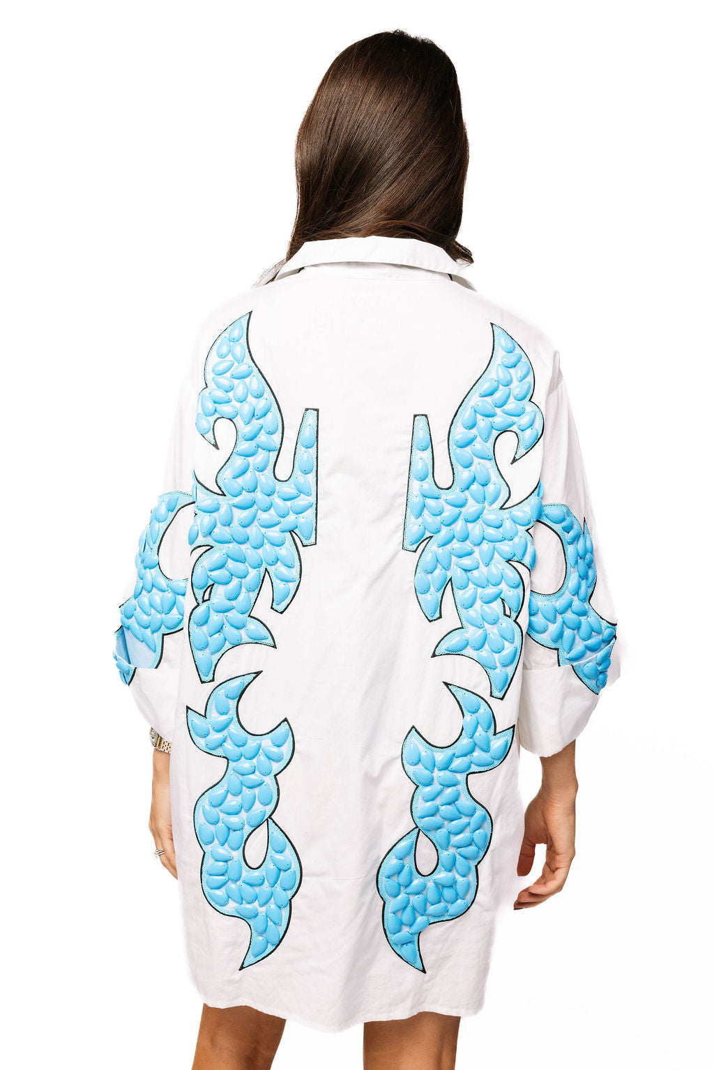 White & Jeweled Turquoise Button Up Cotton Tunic