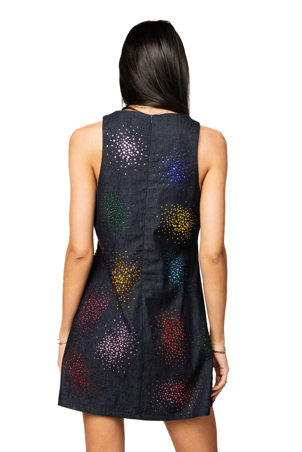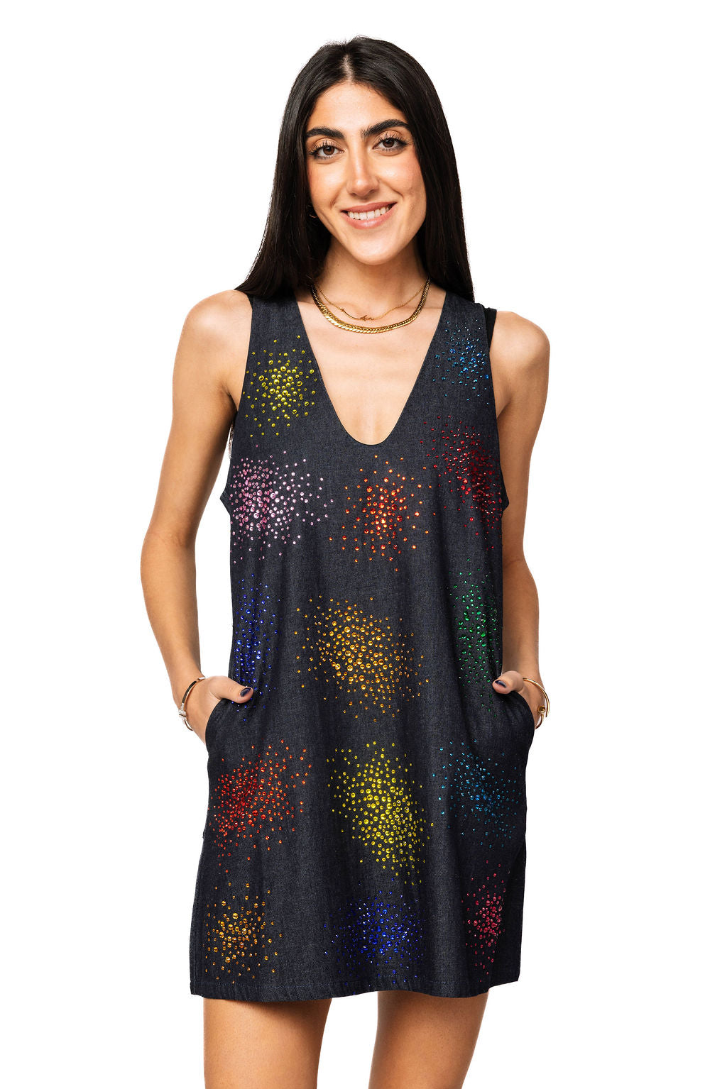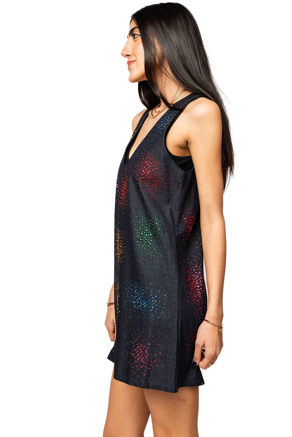 Sample Dark Denim Rhinestone Burst V Neck Dress