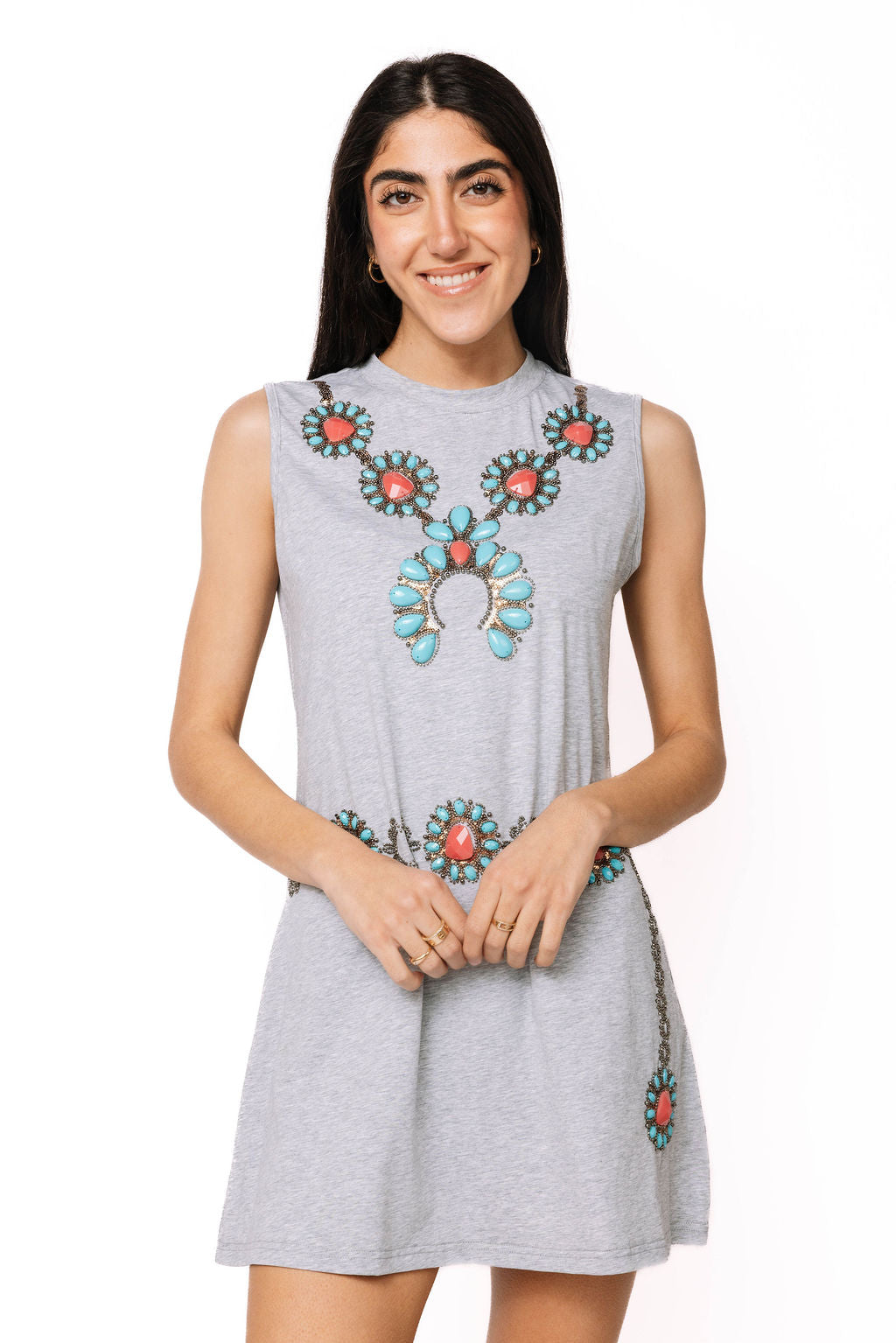 Rock a sophisticated vibe in this sleek grey and turquoise tank dress that's anything but basic. The statement necklace detail elevates your look instantly, transforming a simple silhouette into something special. Perfect for layering over your favorite tee or wearing solo on warmer days, this versatile piece transitions seamlessly from day to night. Comfortable, chic, and ready for whatever adventure comes your way.