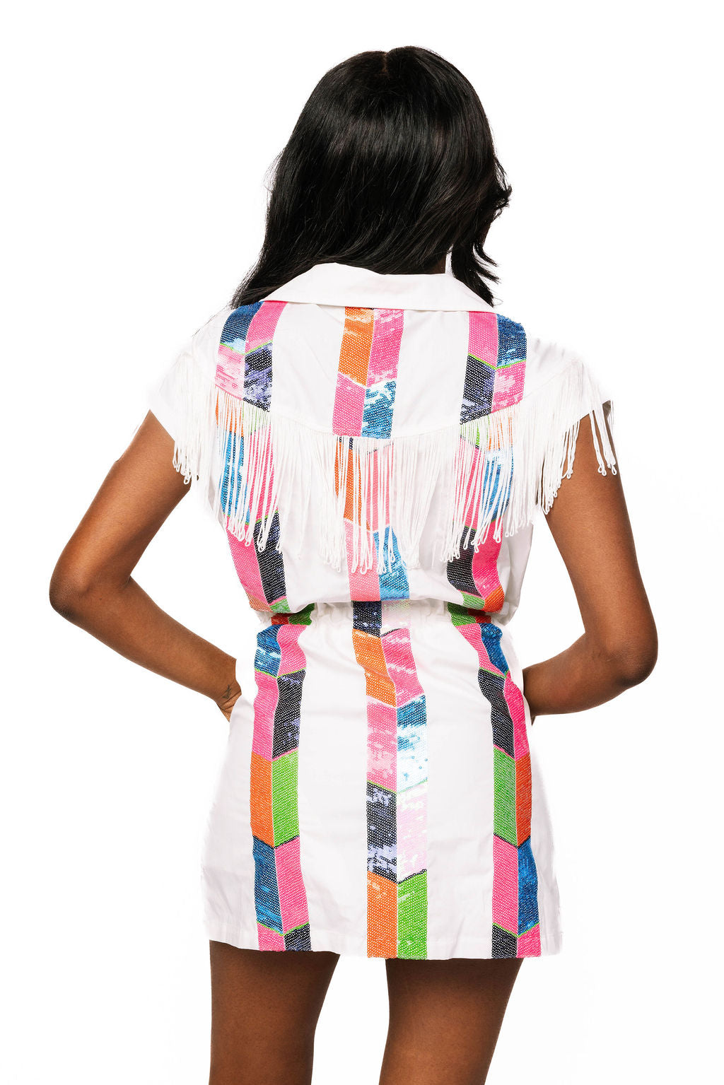 Sample White Aztec Stripe Fringe Zip Up Dress