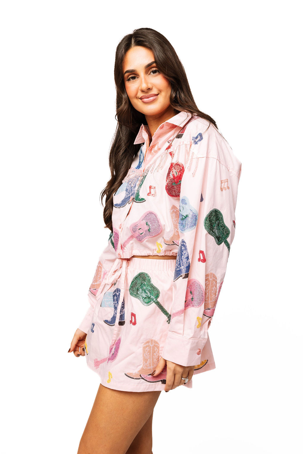 Sing your own song in this adorable light pink set featuring playful guitars and boots graphics that celebrate country spirit. The coordinating top and shorts bring together comfort and style in one fun package, perfect for anyone who loves music and Western vibes. The multi-colored details add visual interest and personality to your everyday look. Whether you're heading to a concert, hanging with friends, or just want to express your love of country culture, this set delivers charm and confidence in spades.